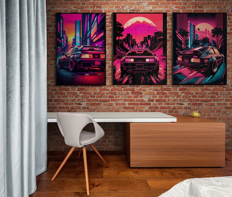 Each poster bursts with vibrant colors and sleek designs, showcasing legendary JDM machines like the Nissan Skyline GT-R, Toyota Supra, and Honda Civic Type R. The posters’ modern and minimalist aesthetic complements any bedroom style, creating a captivating ambiance that invites dreams of speed and automotive prowess.