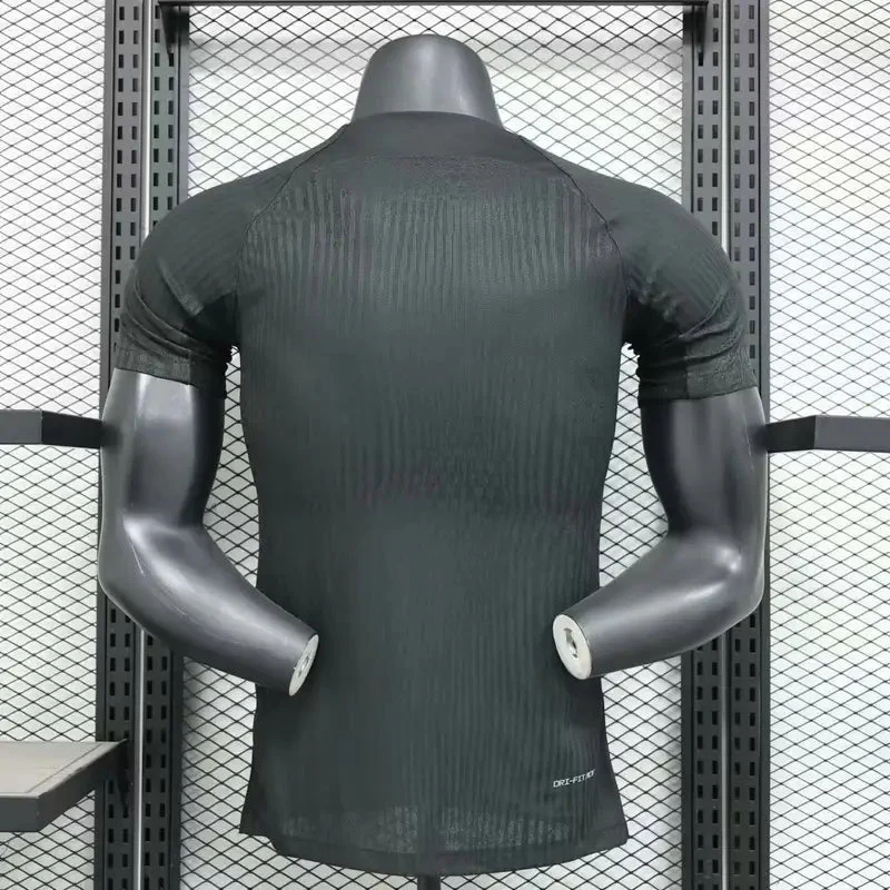 Ce maillot se distingue par son noir profond, accentué par des détails gris ton sur ton, mettant en avant la puissance et la sobriété du club. Fabriqué en tissu ultra-respirant, il assure un confort optimal pendant l’effort comme au quotidien.