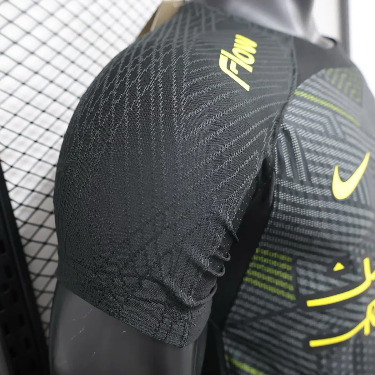 Le maillot arbore une base noire élégante, rehaussée de touches jaunes dynamiques, reflétant l’identité vibrante d’Al-Ittihad. Fabriqué en 100% polyester respirant, il garantit une circulation d’air optimale et une gestion efficace de l’humidité, pour un confort maximal lors des matchs ou des entraînements intenses.