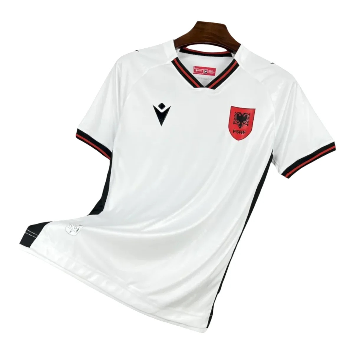 Ce maillot arbore une base blanche épurée rehaussée par des détails rouges et noirs sur les manches, les flancs et le col, évoquant les couleurs du drapeau albanais.