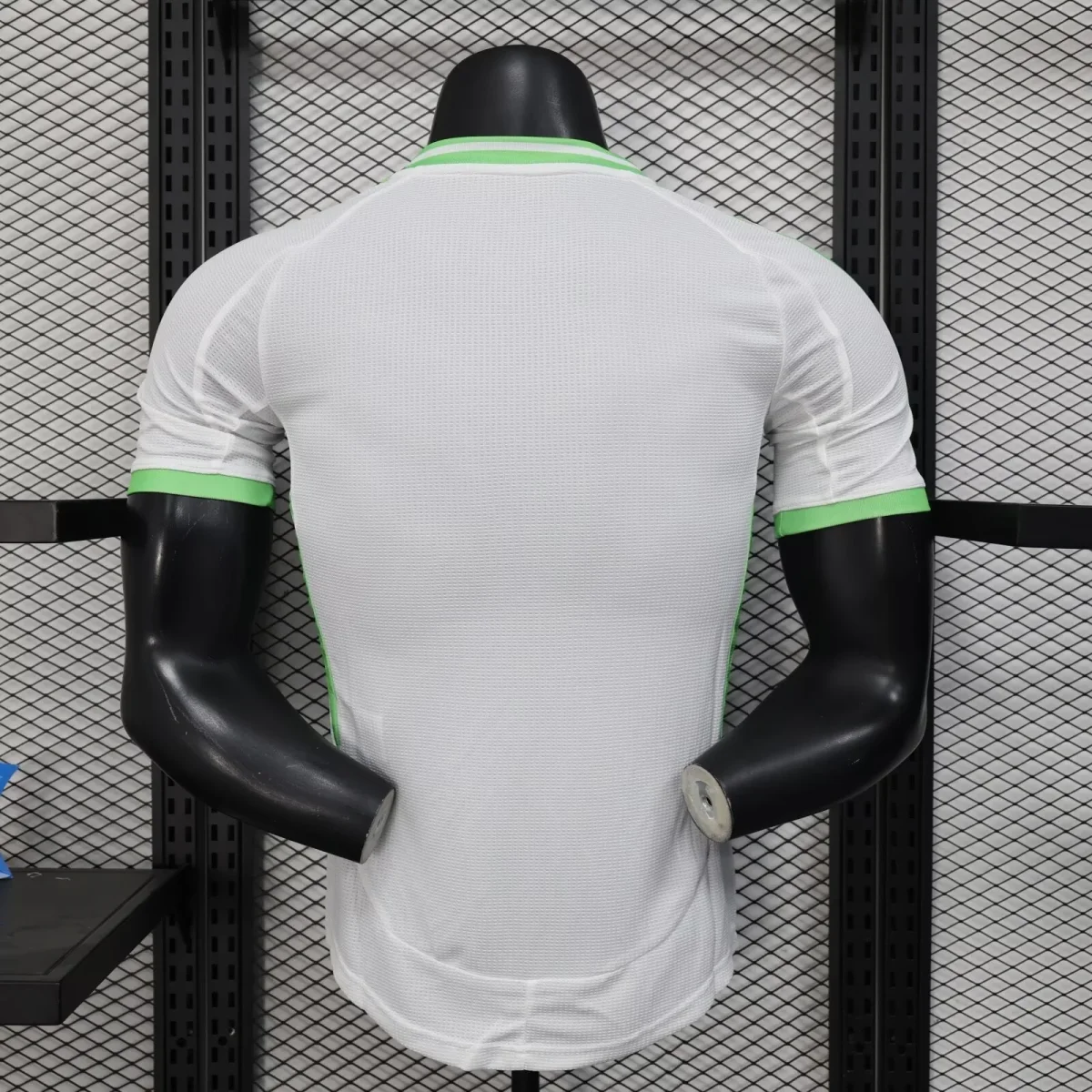 Ce maillot présente un fond blanc éclatant, rehaussé de détails verts sur les épaules, le col et les manches, rappelant les couleurs nationales.