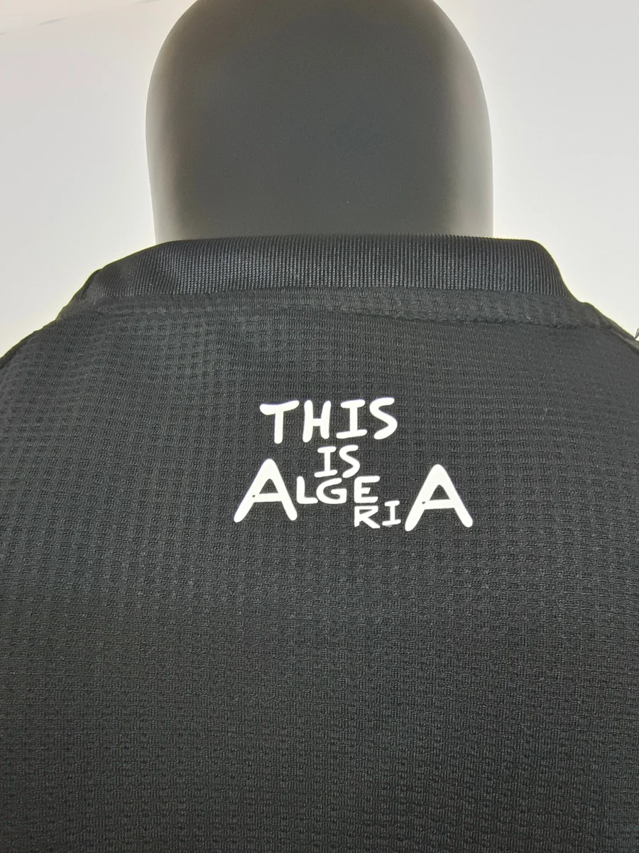 Ce maillot arbore un noir intense avec des touches blanches épurées, reflétant à la fois la puissance et la sobriété de l’équipe algérienne. Son tissu technique permet une respirabilité maximale et un confort durable même lors des efforts intenses.