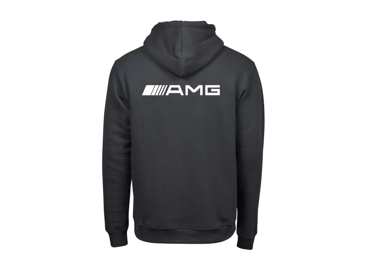 A: The hoodie features the legendary AMG Mercedes logo proudly emblazoned on both the chest and back, capturing the essence of the brand’s racing spirit.