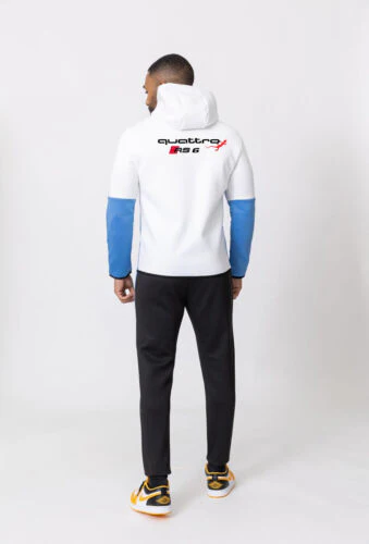 A: This hoodie is designed with a sporty and modern aesthetic, featuring bold lines, iconic RS6 design cues, and a comfortable fit.