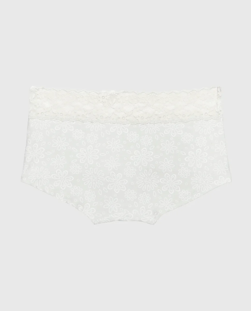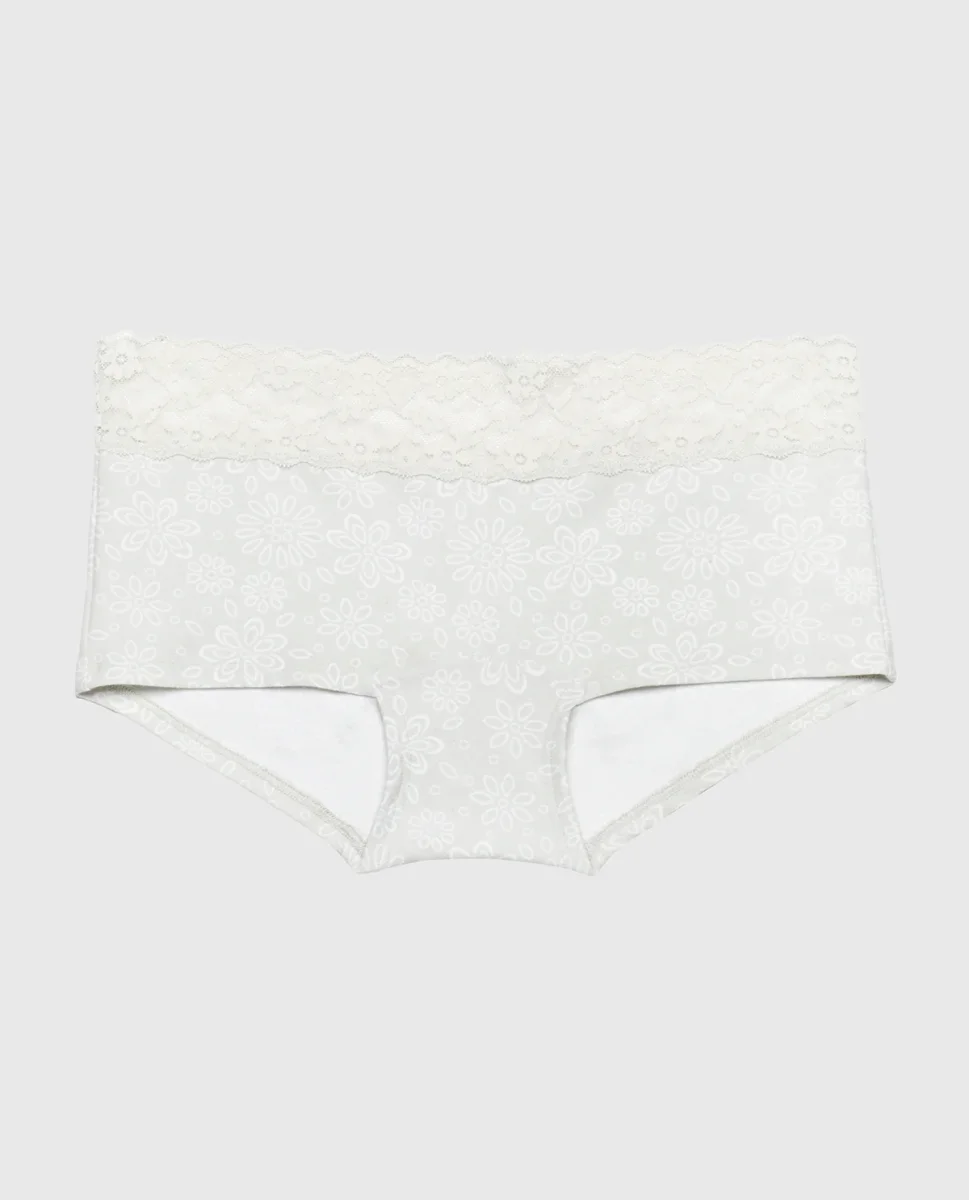 This Boyshort Panty with Lace Trim is perfect for any season. It is designed with a fun print and compliemented by a lace trim, low rise fit, and minimal coverage. Made with imported polyamide and elastane, fits true to size.