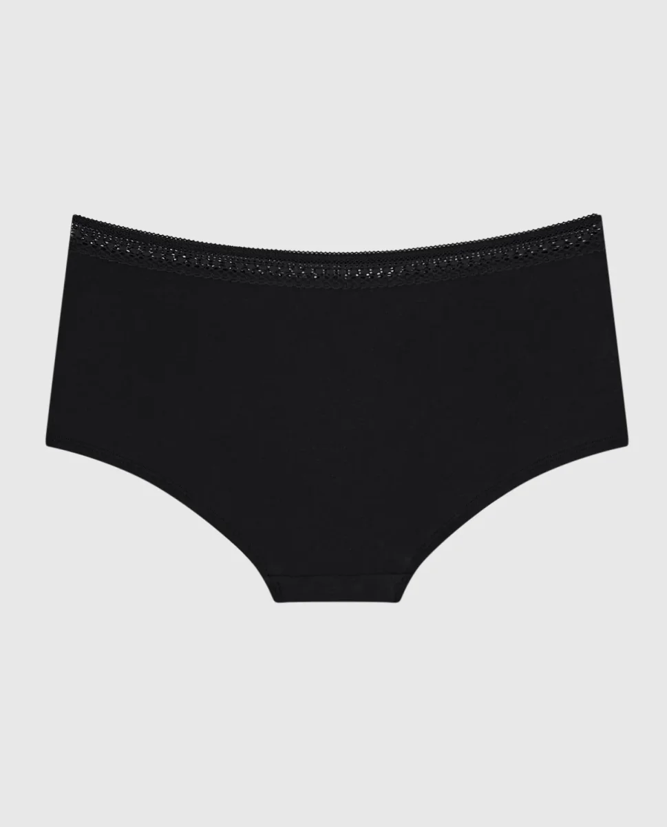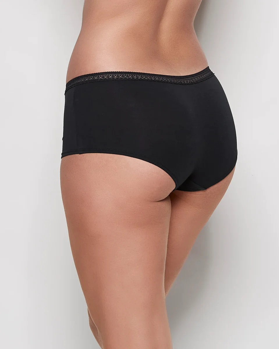 Soft, breathable, and designed to move with you—Our Black Boyshort Panty with Elemental Trim adds a touch of refined elegance to an everyday classic. Fits true to size.