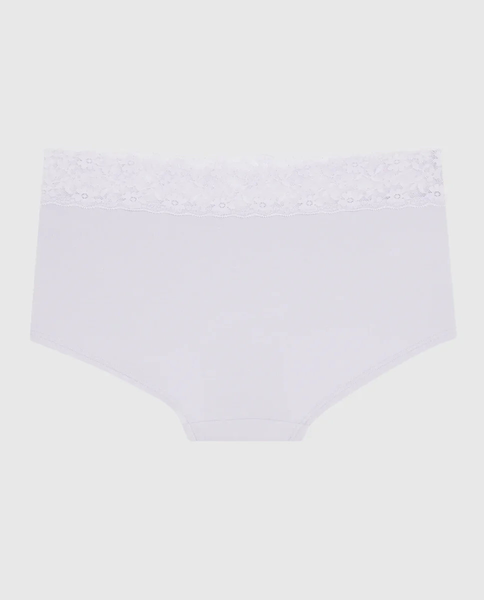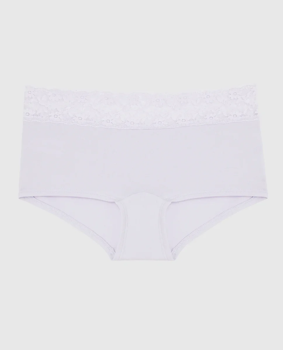 Comfortable, soft, and perfect for everyday. Our Boyshort Panty with Lace in Lavender Cake is sure to be your new go-to. It is made with ultrasoft materials and delicate lace for an instant feminine feel. Fits true to size.