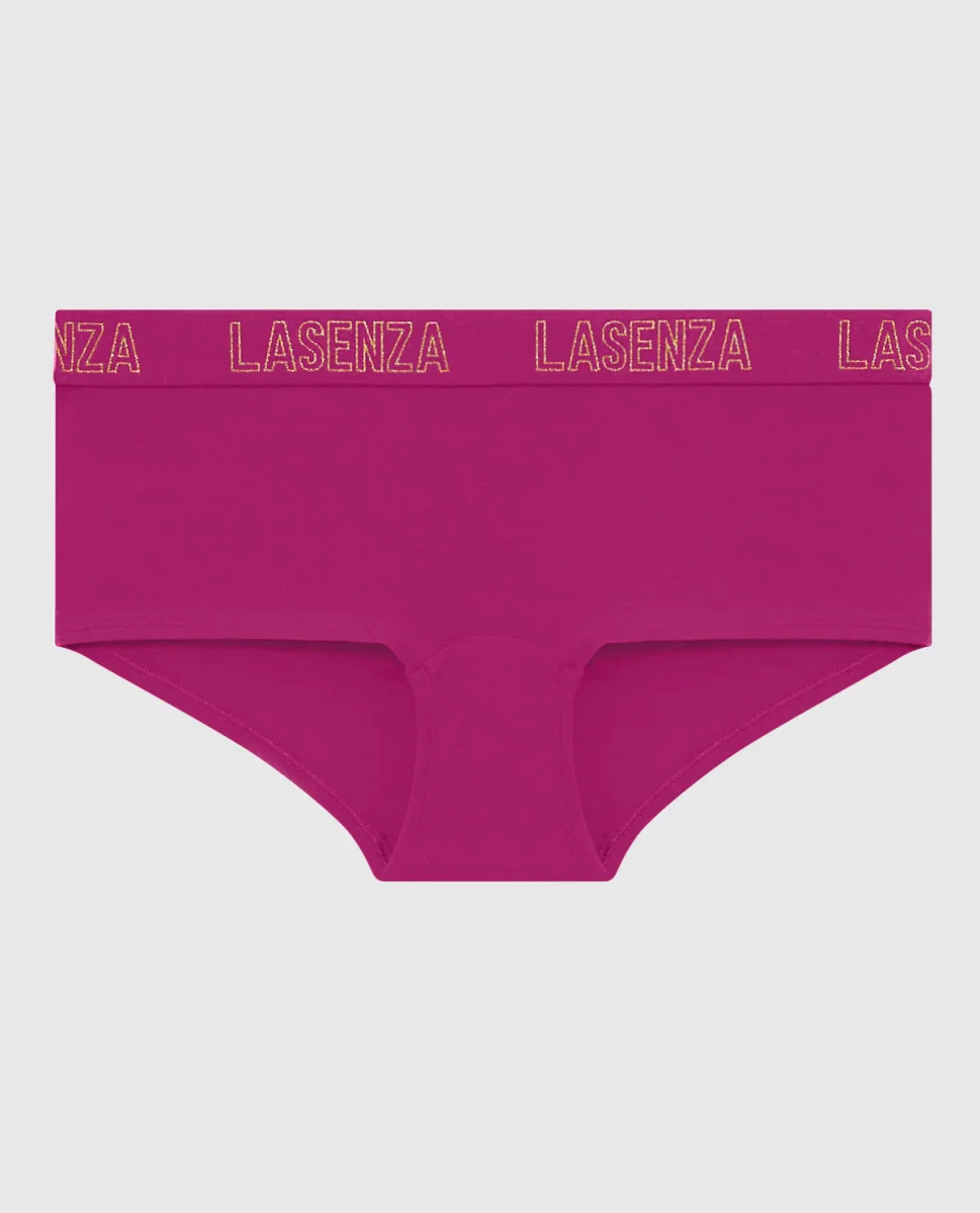 Smooth cotton mixed with trendy logo, this boyshort panty is a must-have! Super soft cotton with a logo waistband and full coverage. Imported cotton, elastane.
