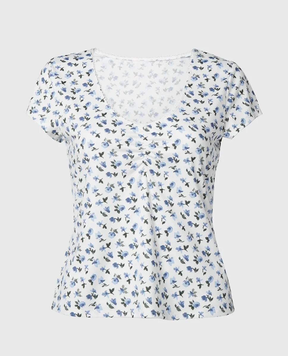 Casual Sleep Jersey V Neck Top With Picot Trim in Breezy Mid Floral