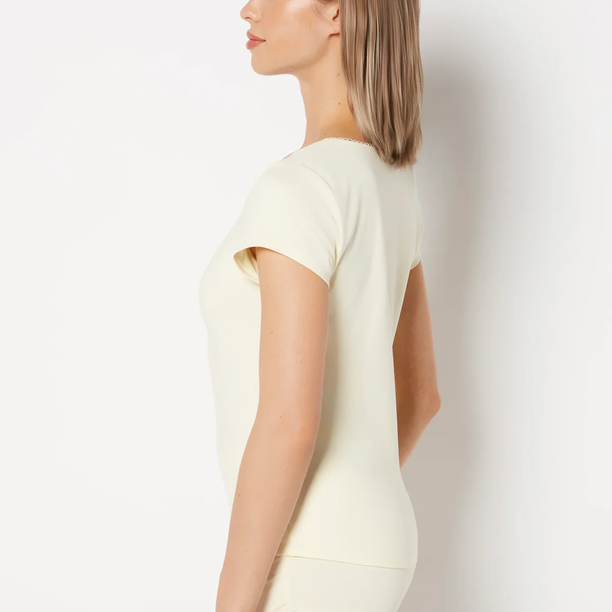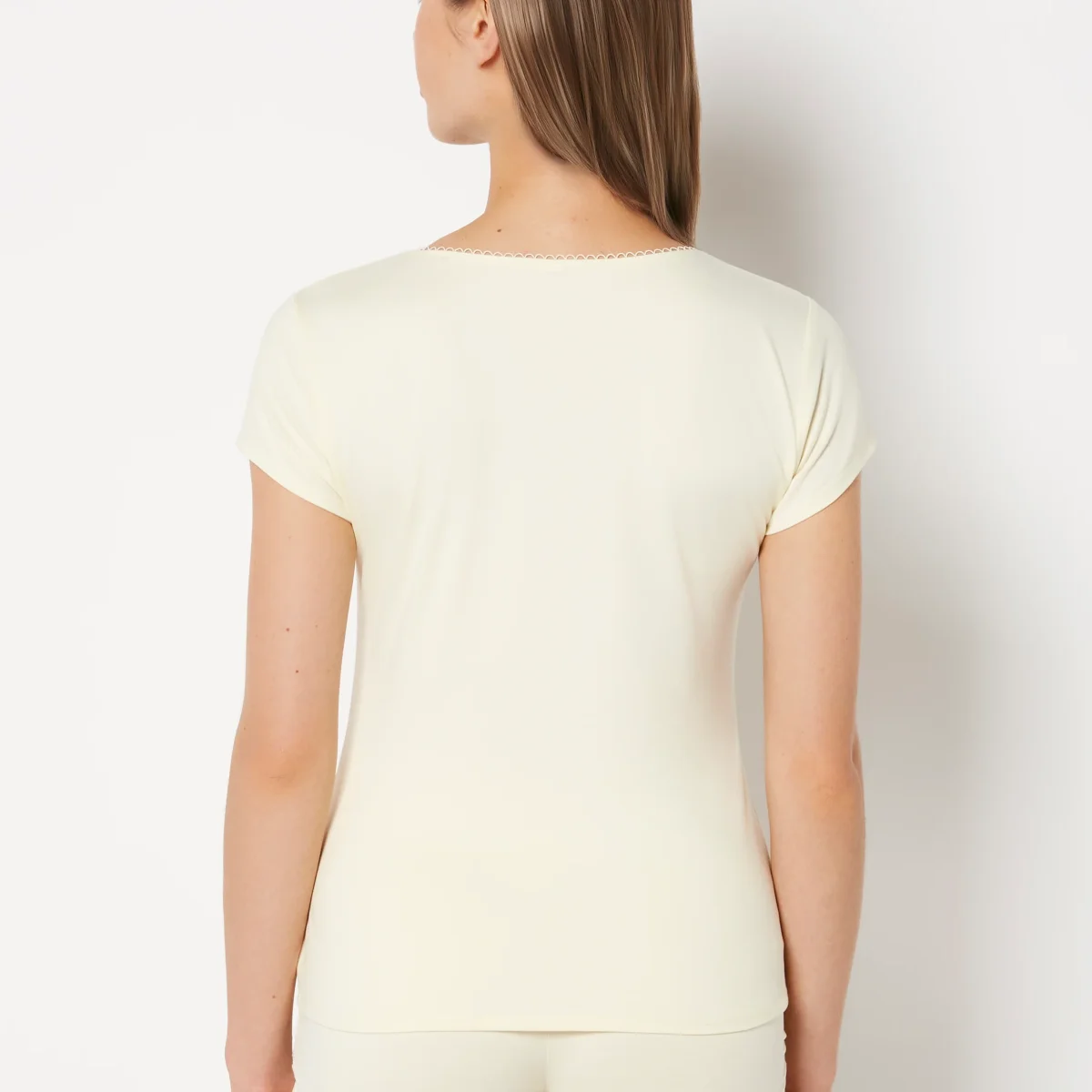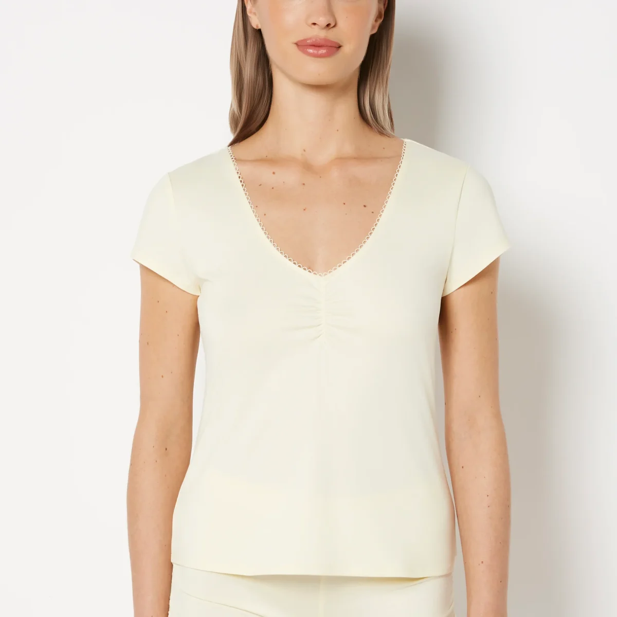 Casual Sleep Jersey V Neck Top With Picot Trim in Lemon Icing