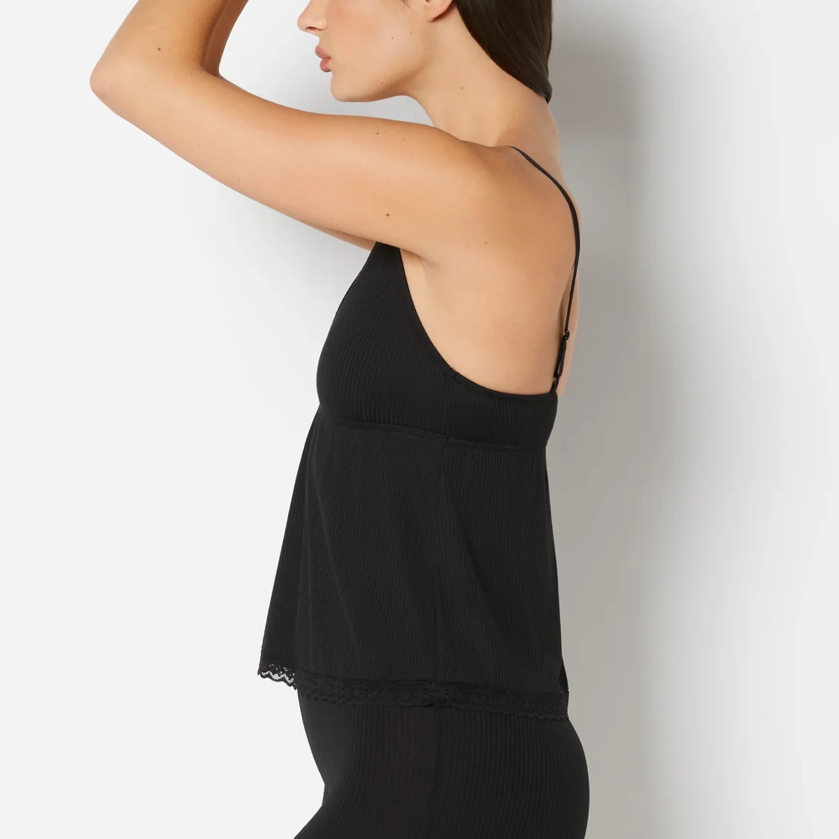 Casual Sleep Ribbed V Neck Tank With Lace Trim in Tuxedo Black