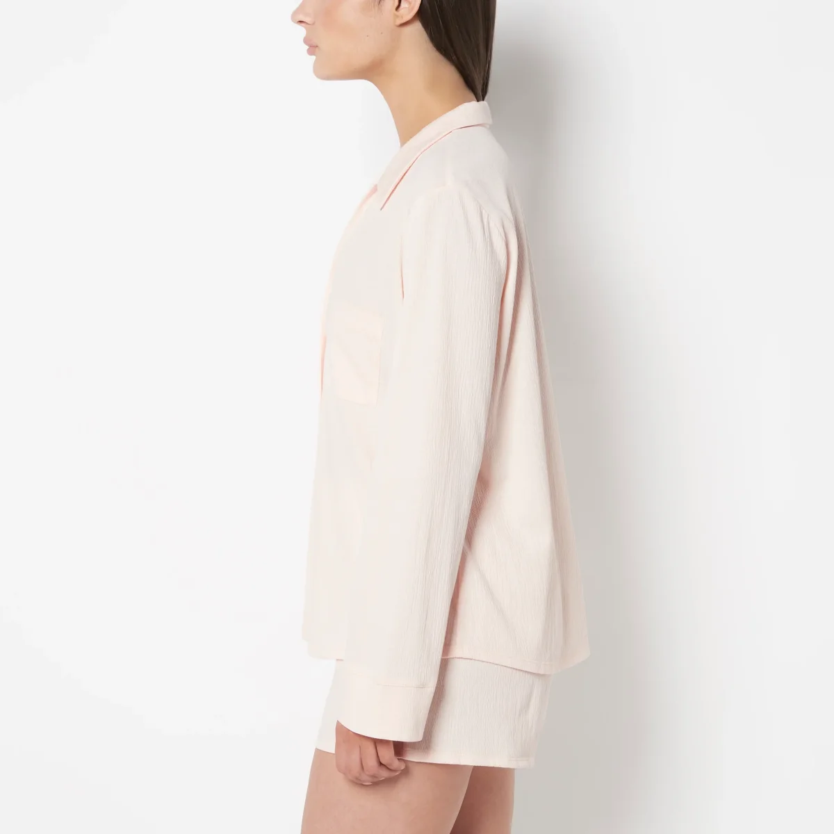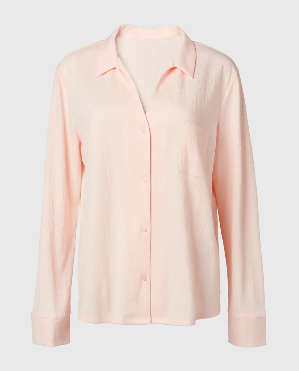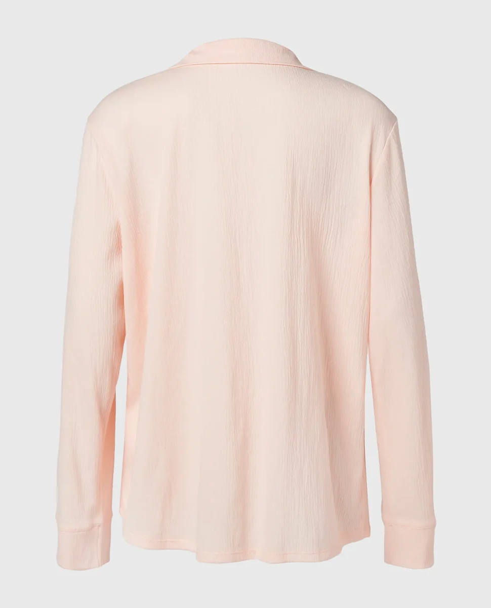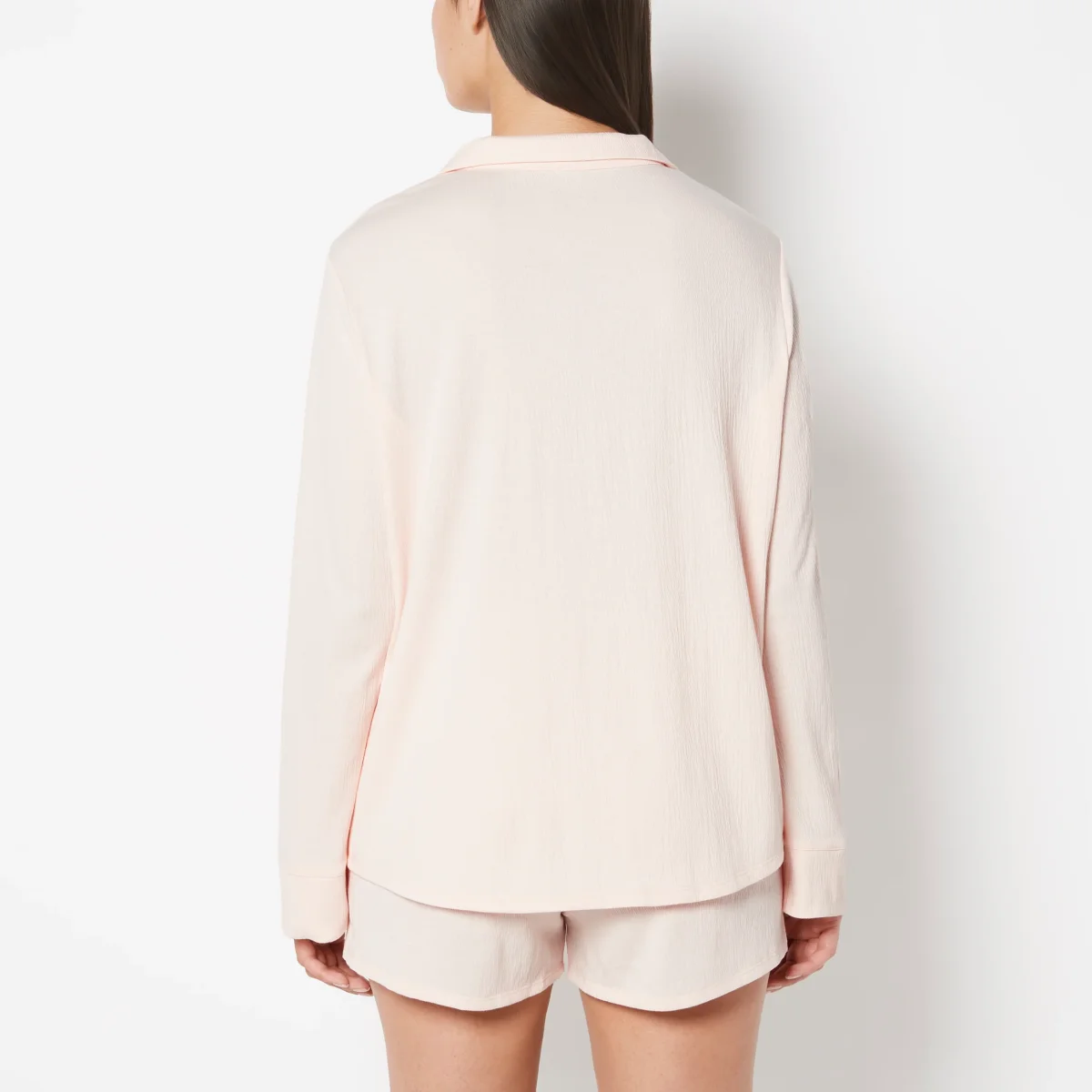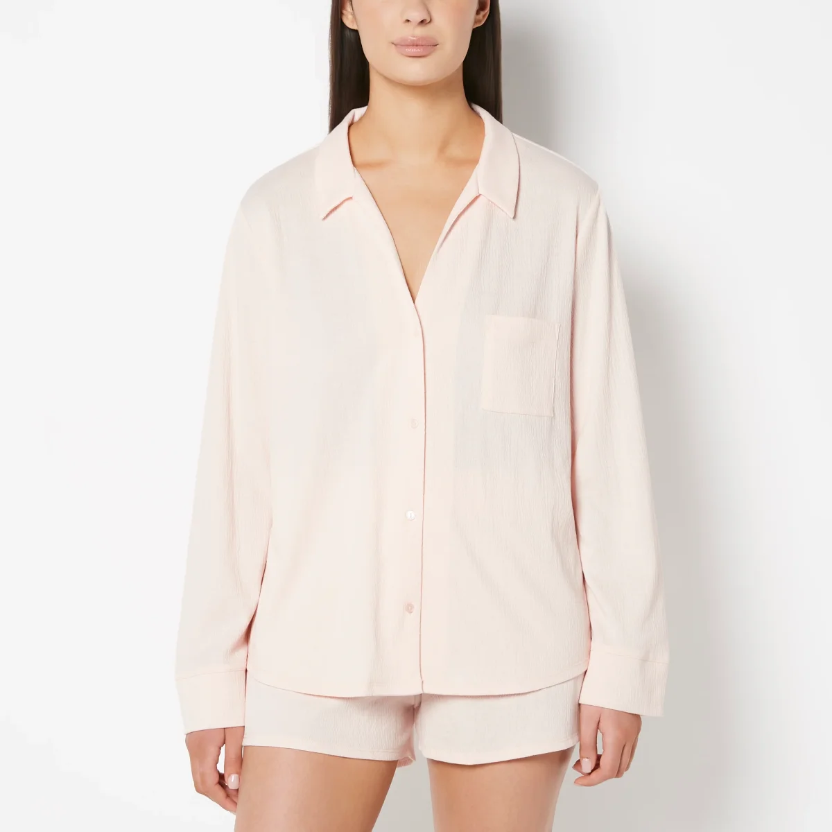 Wrap yourself in gentle warmth with this textured crepe knit button-down sleep shirt in soft pearl blush. The long sleeves provide cozy coverage, while the full button front allows easy dressing and layering versatility. The tactile knit fabric feels luxurious against your skin and breathes beautifully through the night. Pair it with matching bottoms for a coordinated set, or wear solo for effortless comfort.