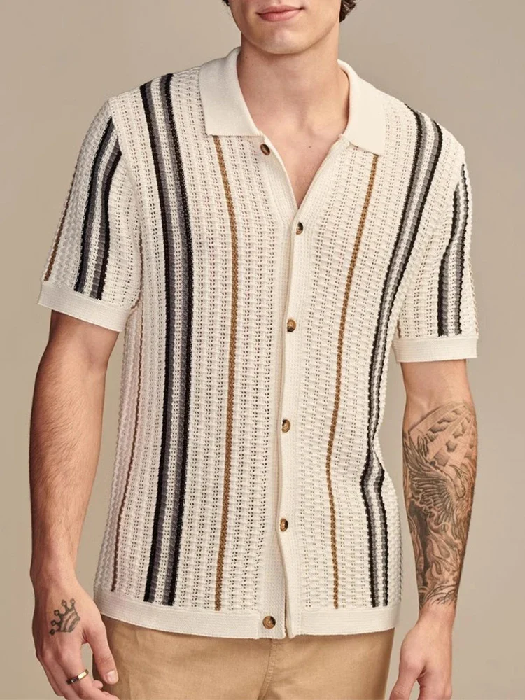 Cette chemise en tricot ultra-légère est fabriquée à partir de viscose premium avec un tissage ouvert et respirant qui laisse l’air passer tout en offrant un style rétro avec ses rayures. Portez-la ouverte, boutonnée ou superposée.