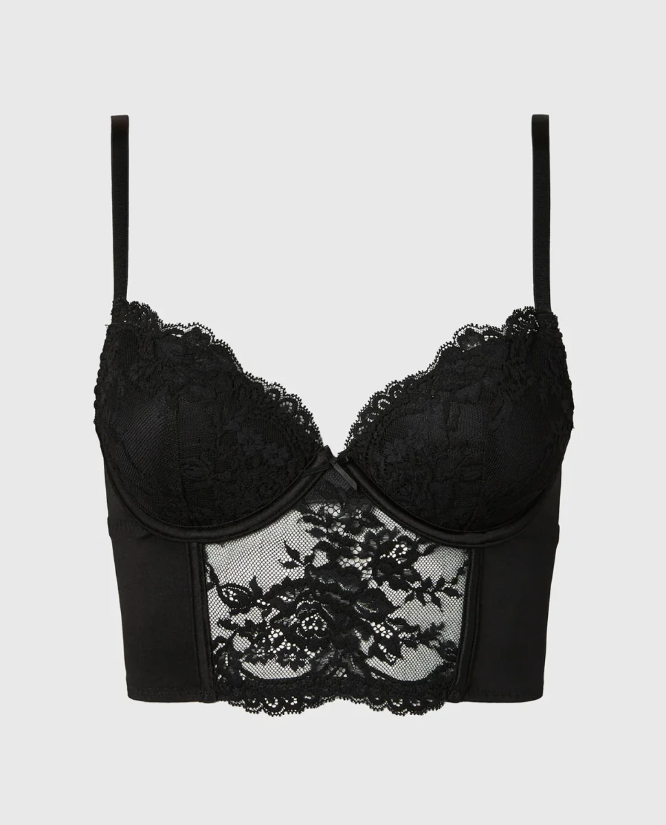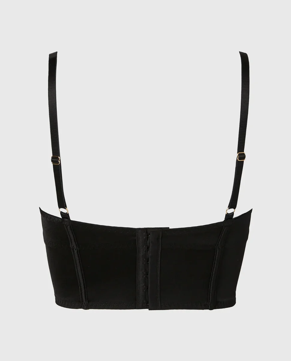 Experience a refined fit with the Demi Cup Bustier Bra Top in Tuxedo Black. Part of the lingerie collection, crafted in premium microfiber, featuring a lightly lined lining for a smooth feel, with a underwire design for gentle support, and a back-close closure. Crafted for all-day ease and modern appeal.