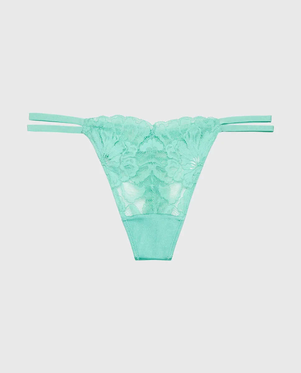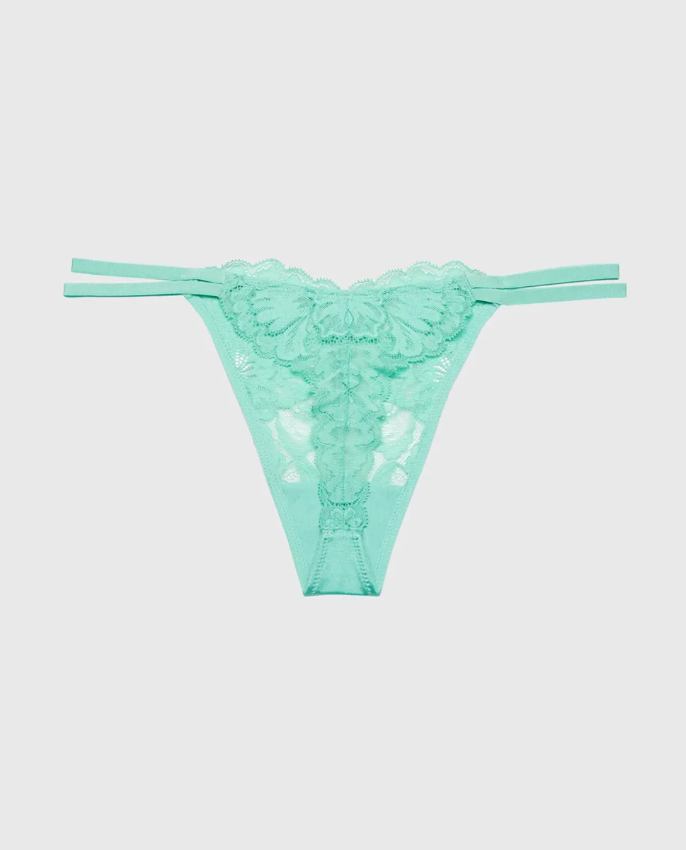 Make a statement with this pool blue string thong, where bold lace detailing meets modern minimalism. The high leg cut creates a flattering silhouette while the lavish lace trim adds an unexpected touch of elegance. Designed for confidence, this style delivers a seamless look under fitted clothing without sacrificing on style.