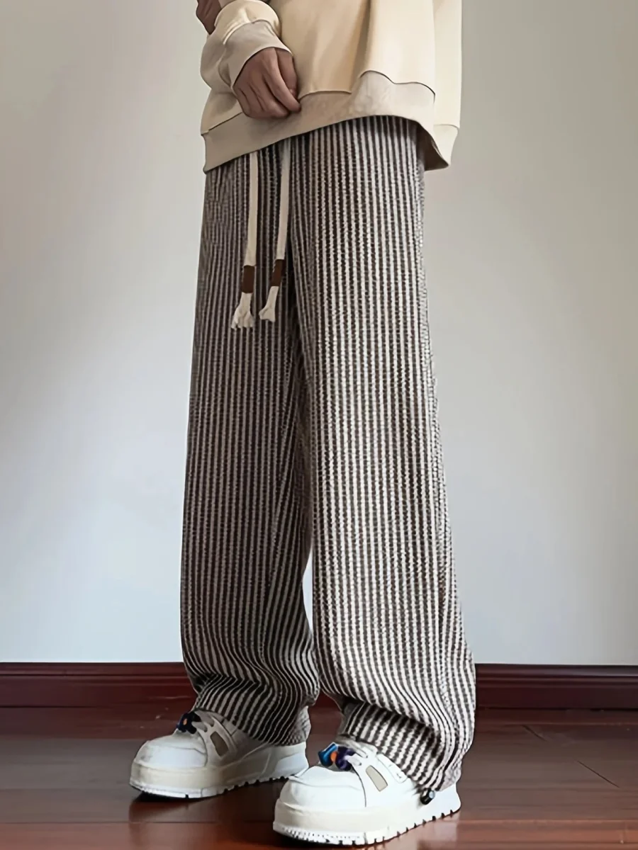 Confectionné avec un doux tricot herringbone et une coupe droite décontractée, ce pantalon se déplace avec vous et améliore chaque tenue. Avec une texture côtelée, un motif à rayures verticales et un drapé doux, il trouve le parfait équilibre entre confort et streetwear épuré.