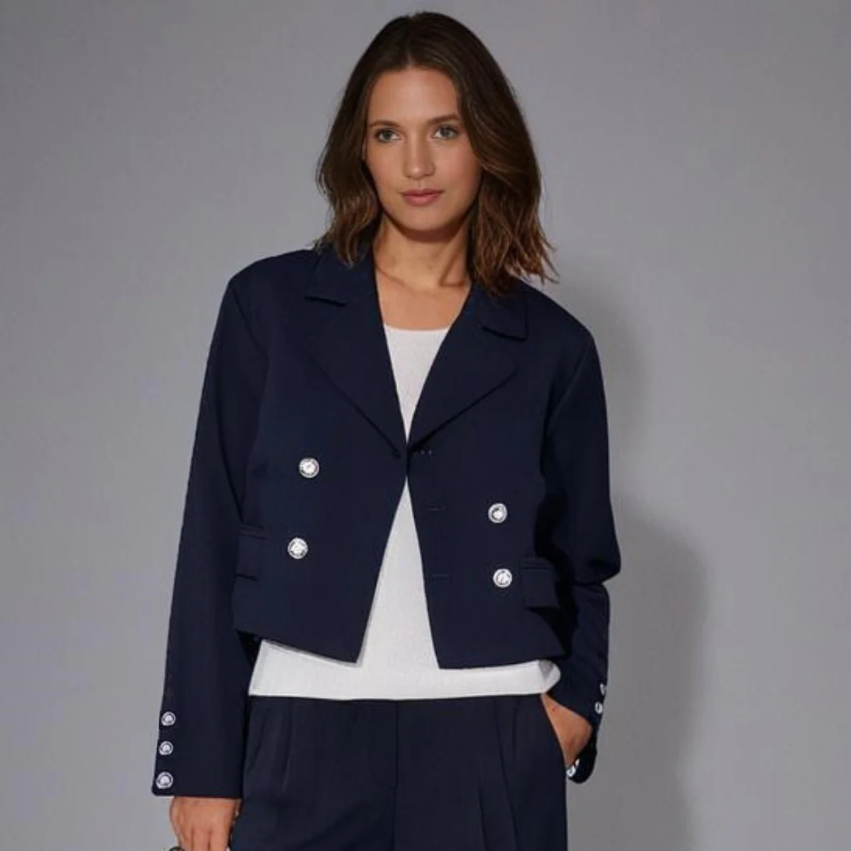 - Style : Double boutonnage élégant et moderne, coupe courte raffinée