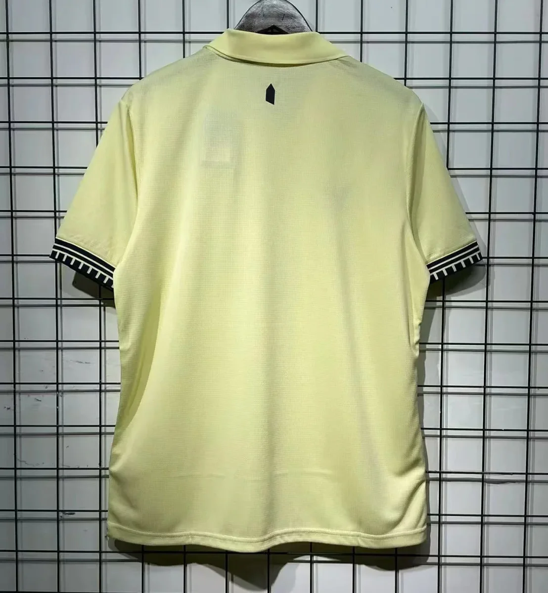 Ce maillot arbore un ton jaune pâle, rehaussé de finitions noires sur les manches, soulignant un style élégant et intemporel. Son col polo traditionnel apporte une touche de classe, parfaite pour les matchs comme pour un look décontracté au quotidien.