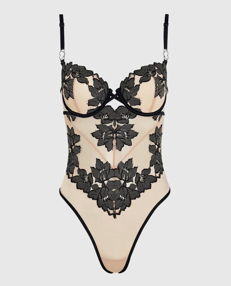 Crafted with meticulous attention to detail this bodysuit will be your new favorite. This bodysuit is designed to give a subtle lift and detailed with heart trinkets along the straps, lace floral details and an open back for the perfect amount of sexy.