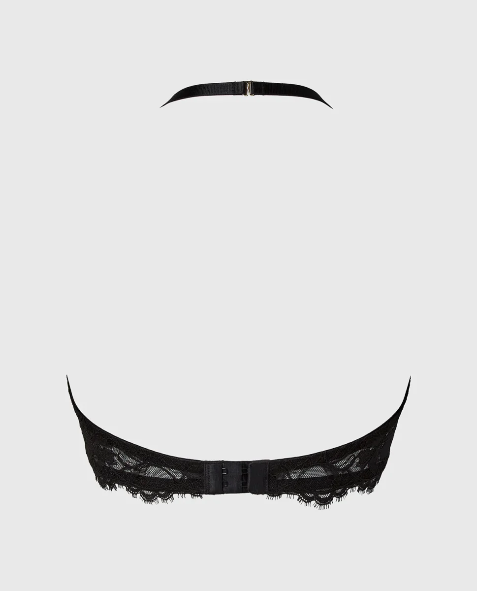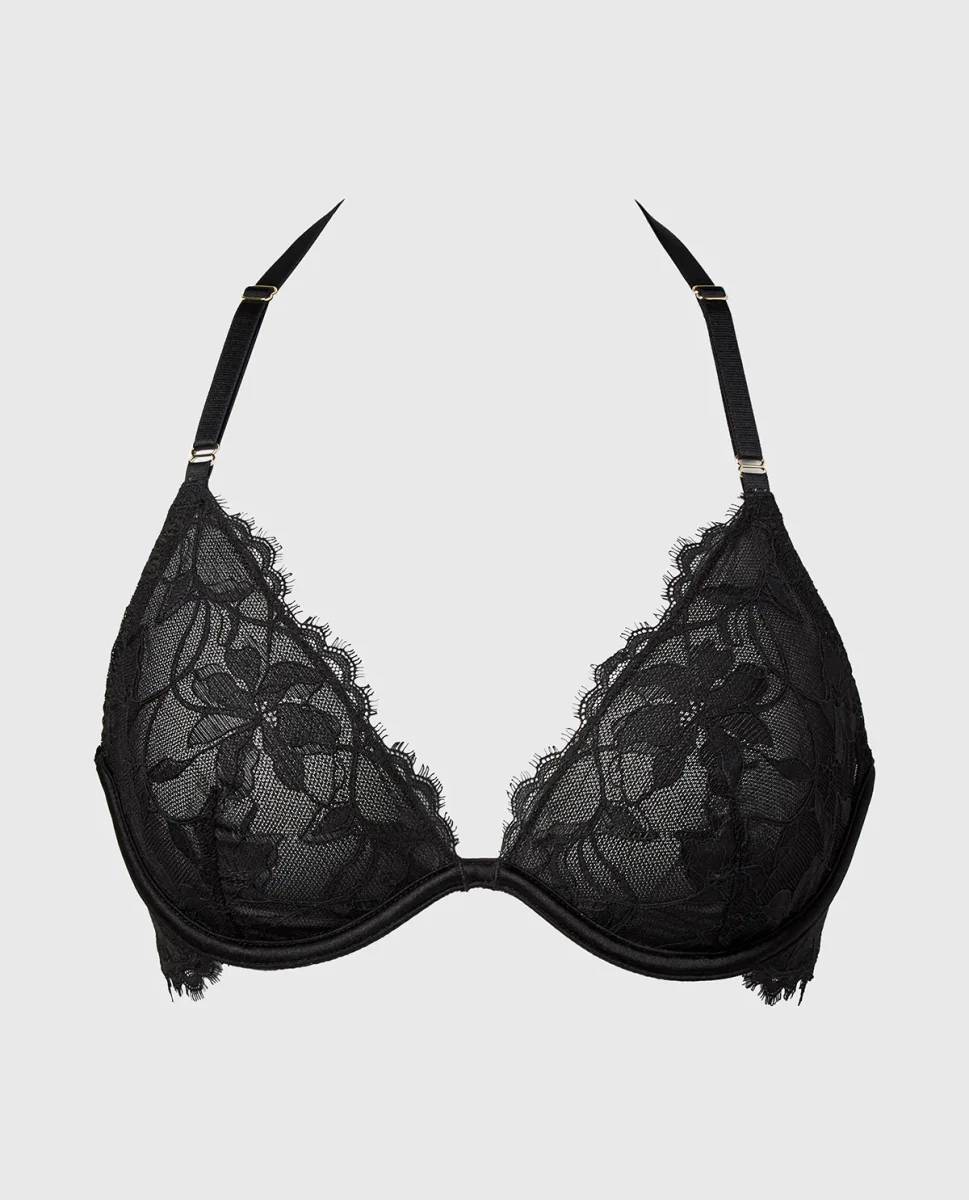 Make a bold statement with this haltered unlined plunge bra, showcasing exquisite Afterglow lace in timeless tuxedo black. The dramatic plunge neckline flatters beautifully, while the unlined construction offers natural shaping and all-day breathability. The distinctive halter straps provide modern sophistication and eye-catching design.