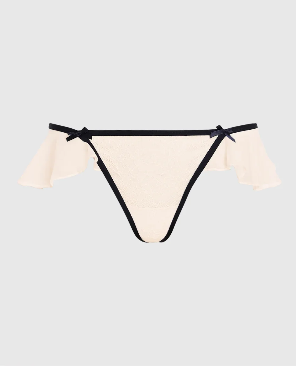 Achieve an alluring look with this high leg G-string panty designed with an allover lace body. This panty features ruffle detailing and bows for an effortlessly feminine feel. Made with imported polyamide and elastane, fits true to size.