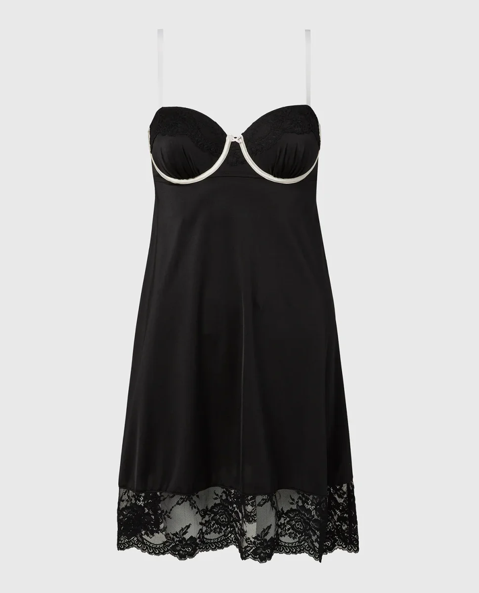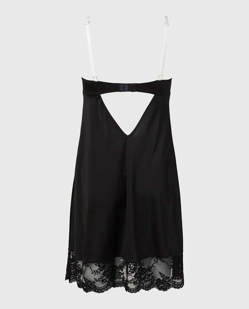 Elevate your collection with the High Shine Microfiber Slip With Opulent Lace in Tuxedo Black. Part of the lingerie collection, crafted in premium microfiber, featuring a lightly lined lining for a smooth feel, with a underwire design for gentle support, and a back-close closure. Tailored for lasting softness and support