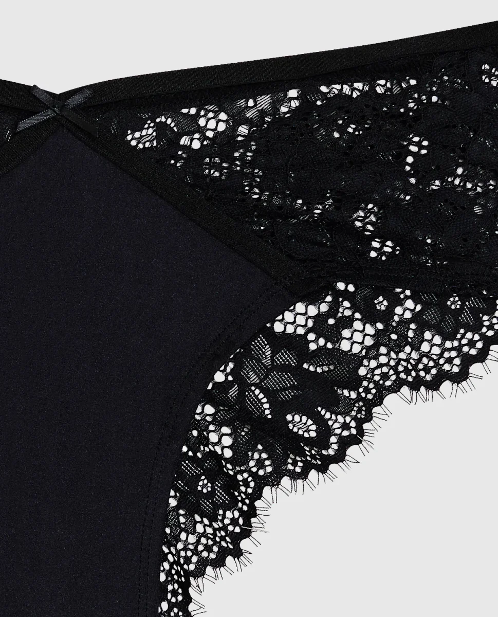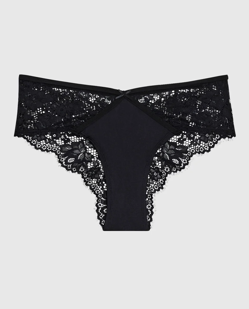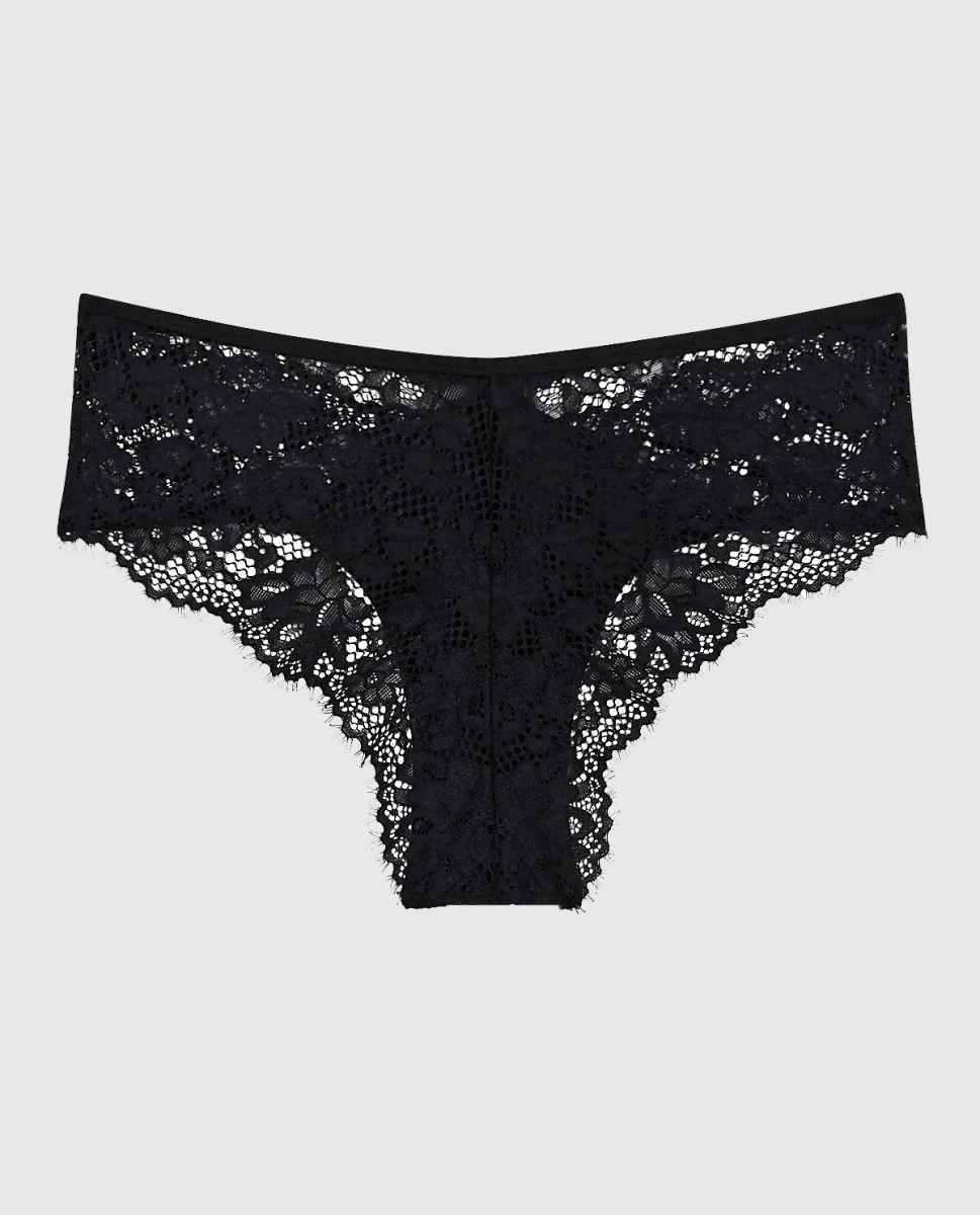 Comfortable, soft and perfect for everyday. This Lace Cheeky Panty in Black is designed with delicate lace detailing throughout for an effortlessly feminine feel. Made with imported polyamide and elastane. Fits true to size.