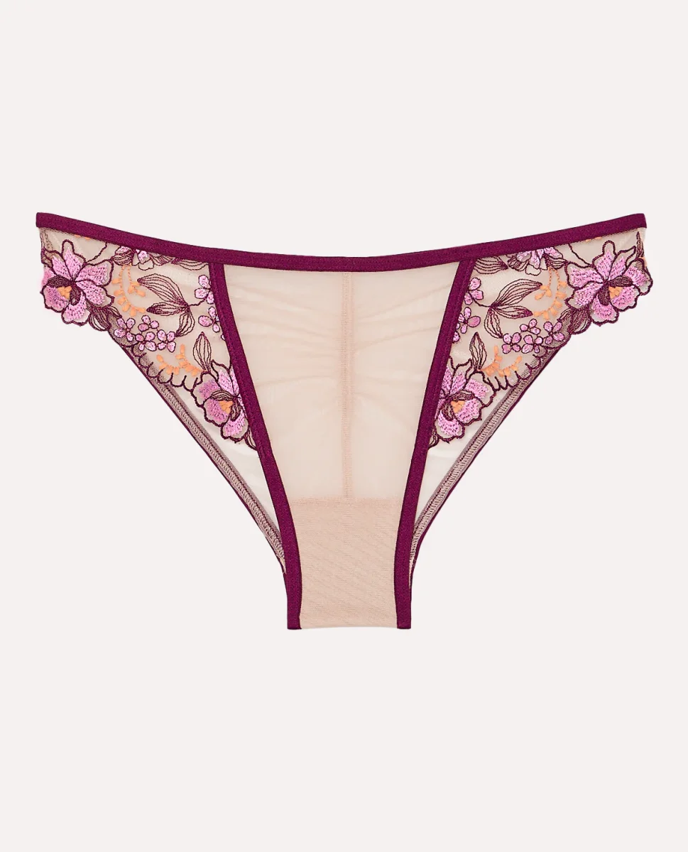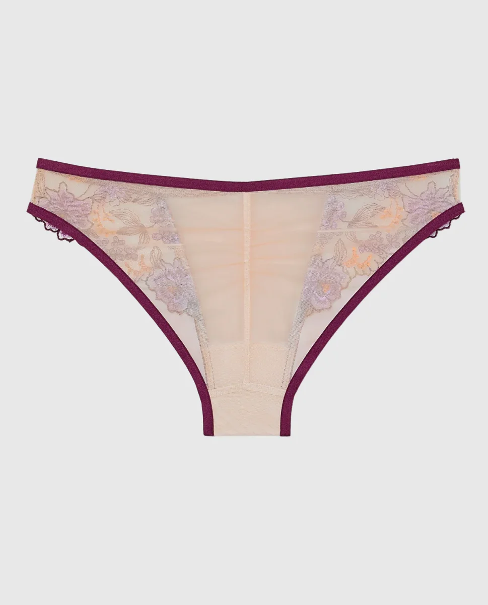 You will love this cheeky panty! Designed with our sheer mesh, embroidered sides and trim with a high leg fit. Pair with the matching bra for a perfect set! Imported polyamide, elastane.