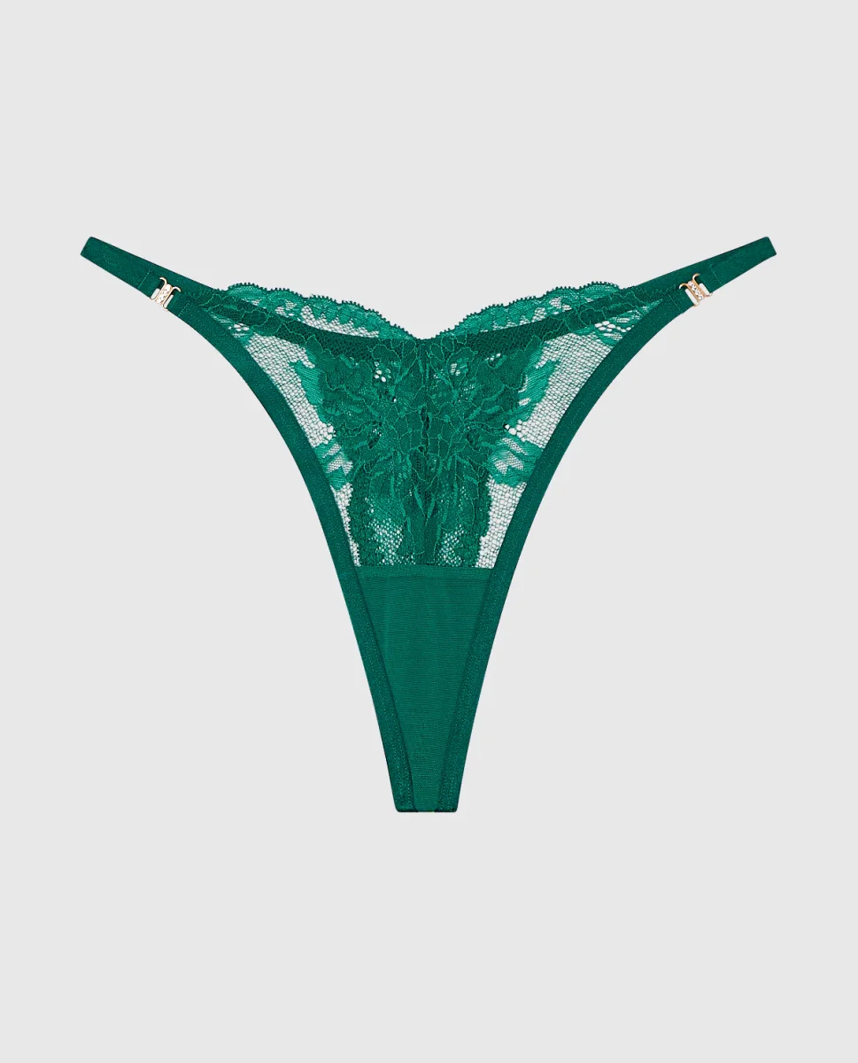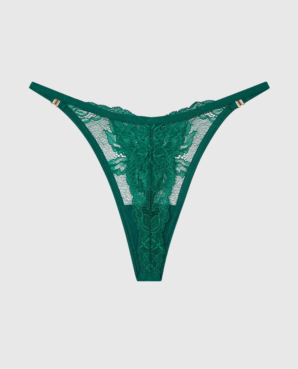 This high leg thong panty is so sexy and is crafted with our stunning lace while offering gold trinkets along the side. Imported polyamide, elastane.