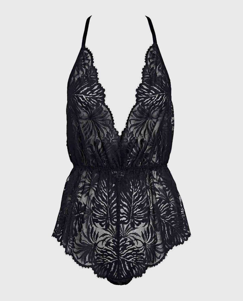 Make your nighttime routine a little more luxurious with this allover lace romper. Allover sheer lace Plunging neckline Pulls on Cheeky coverage Imported polyamide, elastane
