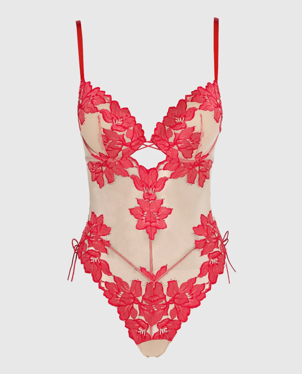 Flirty and Floral! This irresistible bodysuit has an ultra flattering silhouette featuring push-up cups, cut outs through the front and back and simple skinny ties to lace the front and sides. Wear in or out and make this your new bodysuit staple.