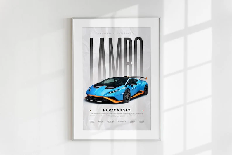 Indulge in the beauty and performance of the Lamborghini Huracán STO with our digital download poster. This exclusive artwork brings the exhilaration of the track into your own space, allowing you to appreciate the prowess of this hypercar masterpiece. Order yours today and unleash the thrill of the STO.