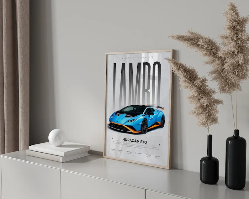 Experience the thrill of owning a Lamborghini Huracán STO, even from the comfort of your home. Visit our website today to purchase and download your exclusive digital poster. Frame it, print it, or use it as a digital background to share your passion for this automotive icon.