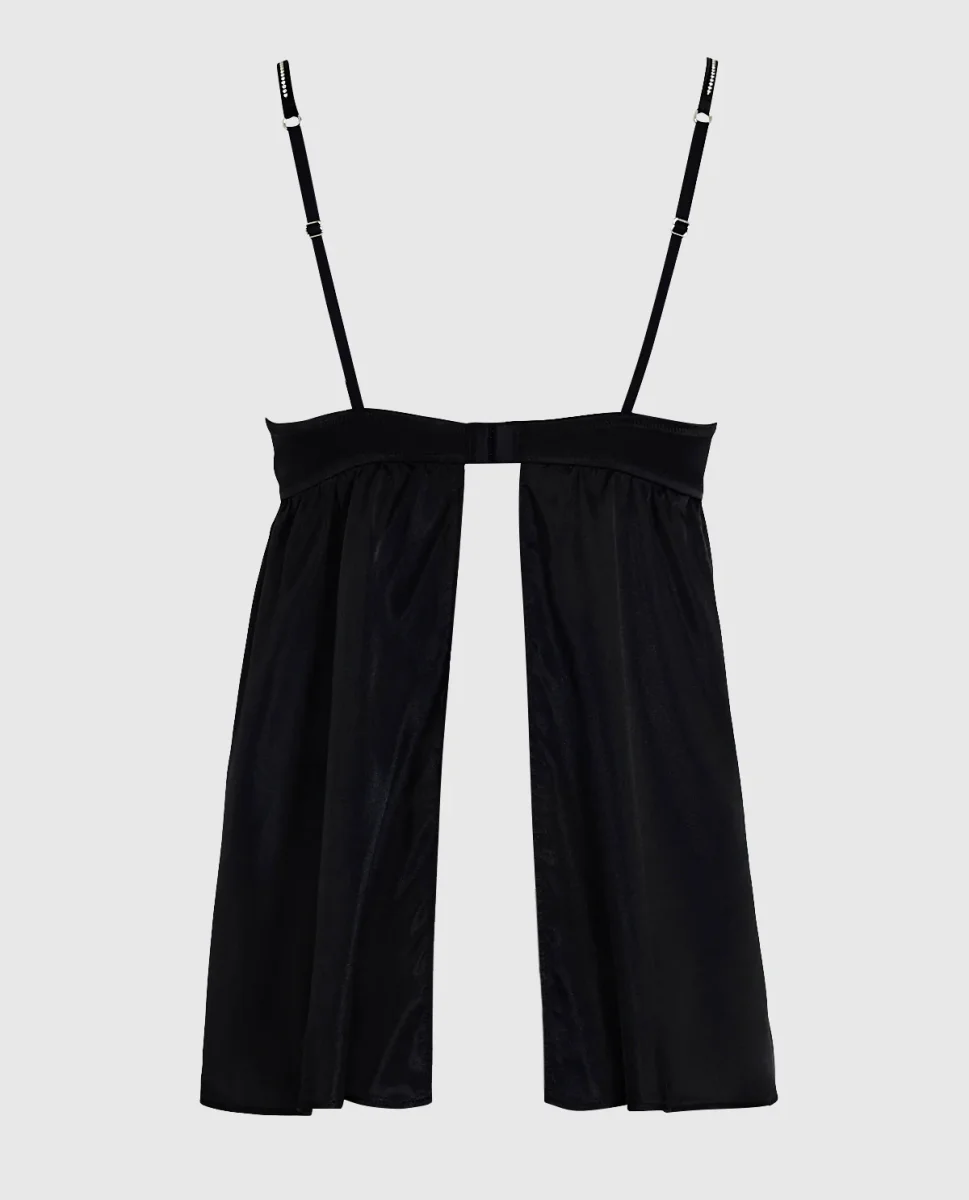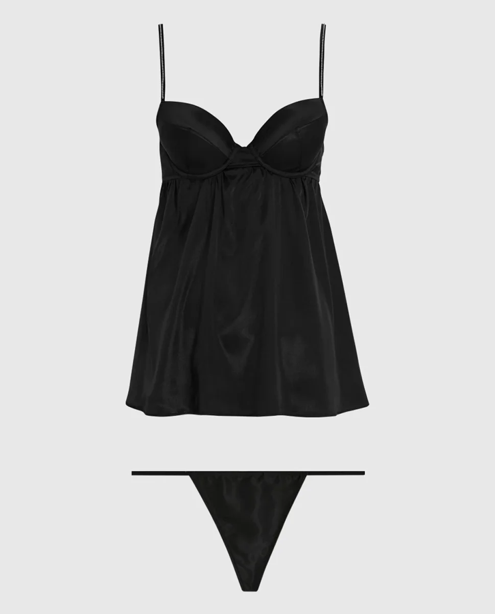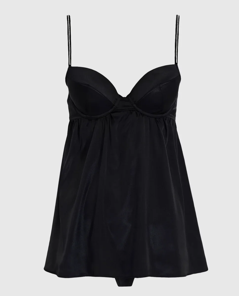 Flirty and Sweet! Embrace your confidence in this satin lightly lined babydoll. With smooth satin and rhinestone straps this is perfect for a night in.
