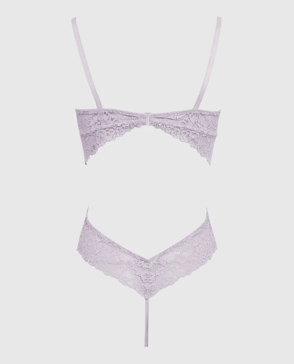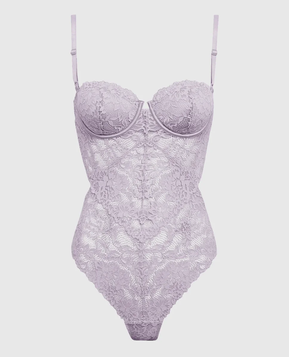 This lightly lined bodysuit is crafted with our newest lace and features cut outs along the sides and back. A luxurious look that’s perfect to wear in or out. Lightly lined balconette cups Lace body Adjustable bra straps Pulls on G-string bottom Cut-out back and sides Back clasp Imported polyamide, elastane