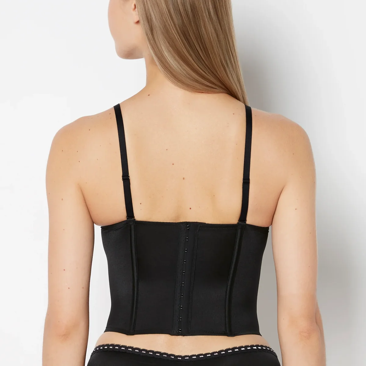Lightly Lined Microfiber Bustier in Tuxedo Black Elevate your silhouette with this sophisticated bustier in classic Tuxedo Black. Sleek microfiber combines with delicate ribbon detailing for a refined, polished look. The underwire construction provides excellent support and shaping, while the back closure ensures a secure, comfortable fit for all-day wear.