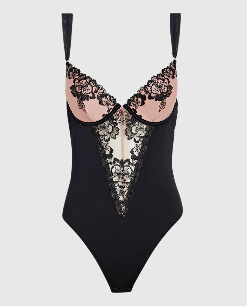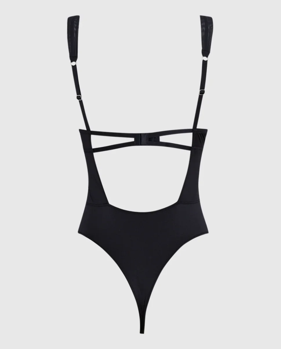 With the perfect mix of lace and shine, treat yourself to this lightly lined plunging bodysuit for a natural, all-you shape. This bodysuit features lace detailing and cut outs in the front and back. and Lightly lined lace cups Underwire for support Cut-out details throughout Adjustable straps Imported poyamide, elastane «