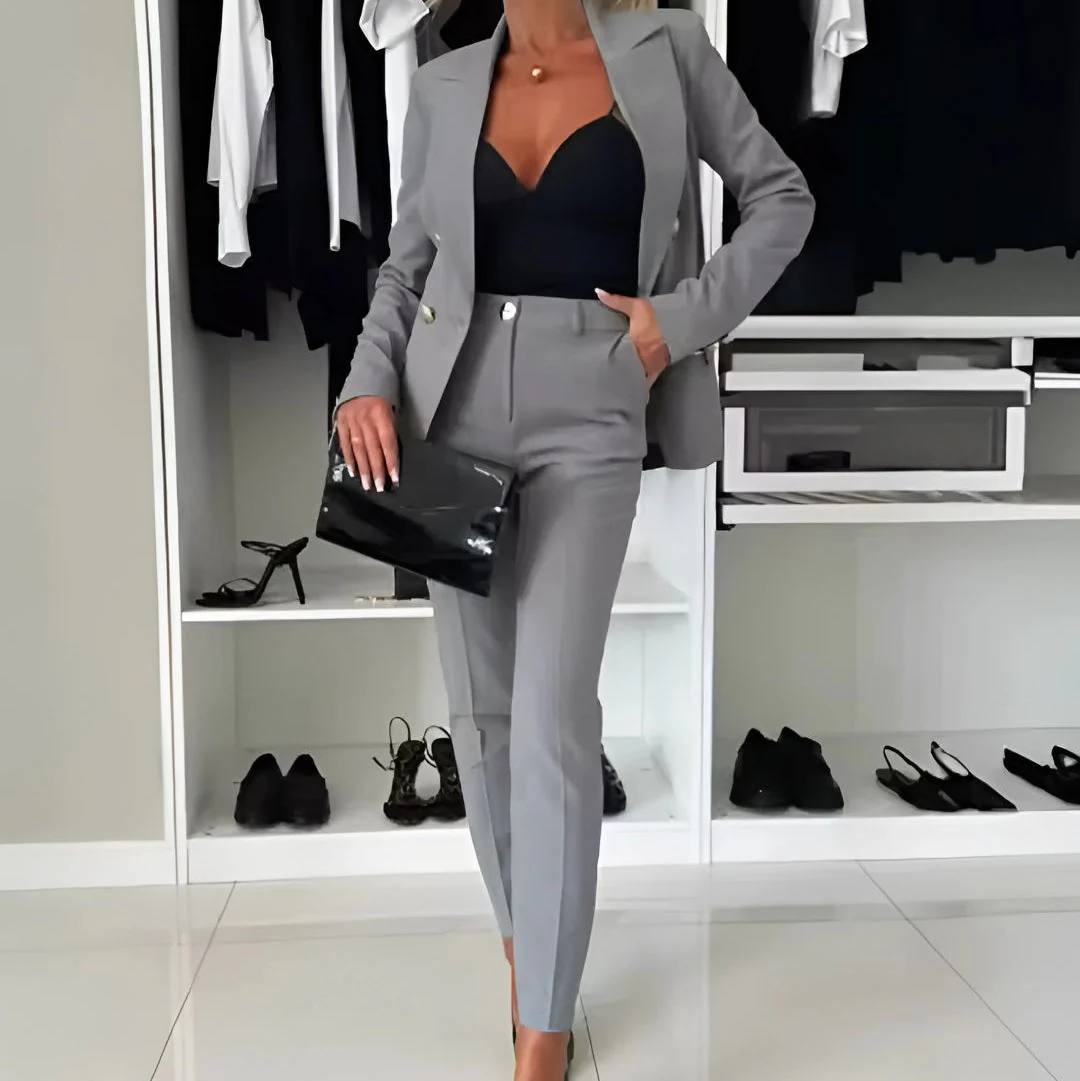 L’ensemble de costume Lily apporte une sophistication structurée à votre garde-robe. Conçu avec un blazer croisé et un pantalon ajusté, il est parfait pour les événements, les bureaux et tout ce qui se trouve entre les deux. Des boutons métalliques et des coutures précises ajoutent du raffinement sans sacrifier la polyvalence quotidienne.