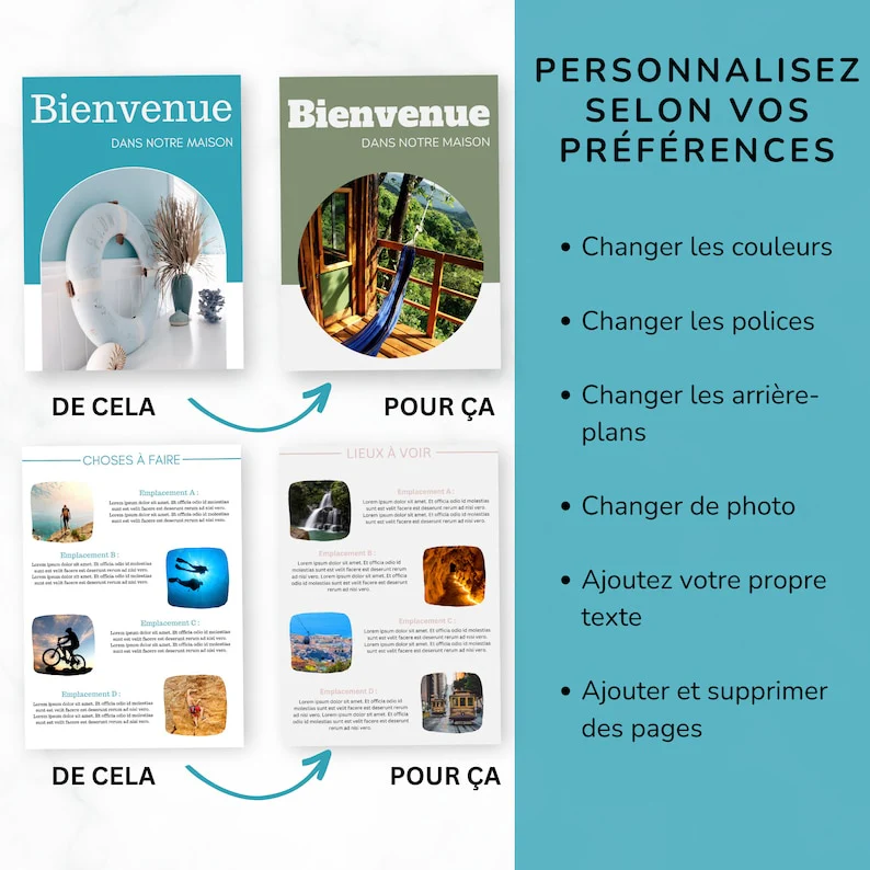 « text »: « Purchase the product, download the PDF from Etsy, access the template in Canva, make your changes, save, and download it as a PDF. You can then email it to your guests or print it for your Airbnb. »
