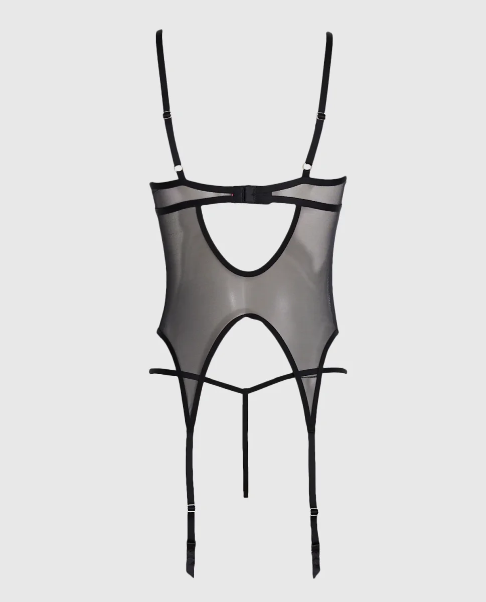 This stunning Black Mesh hook-and-Eye Merrywidow features our latest mesh fabric, accented by a plunging neckline and an eye-catching back cutout. The underwired, contour demi cups offer subtle lift and support, while the hook-and-eye closure at the front adds a touch of edge to complete the luxurious feel. Matching panty included.