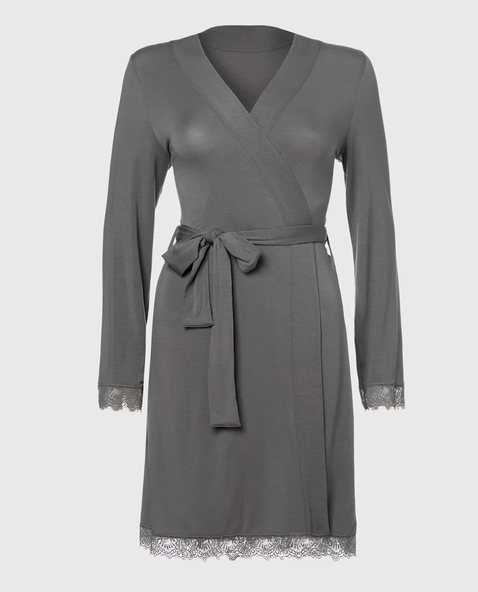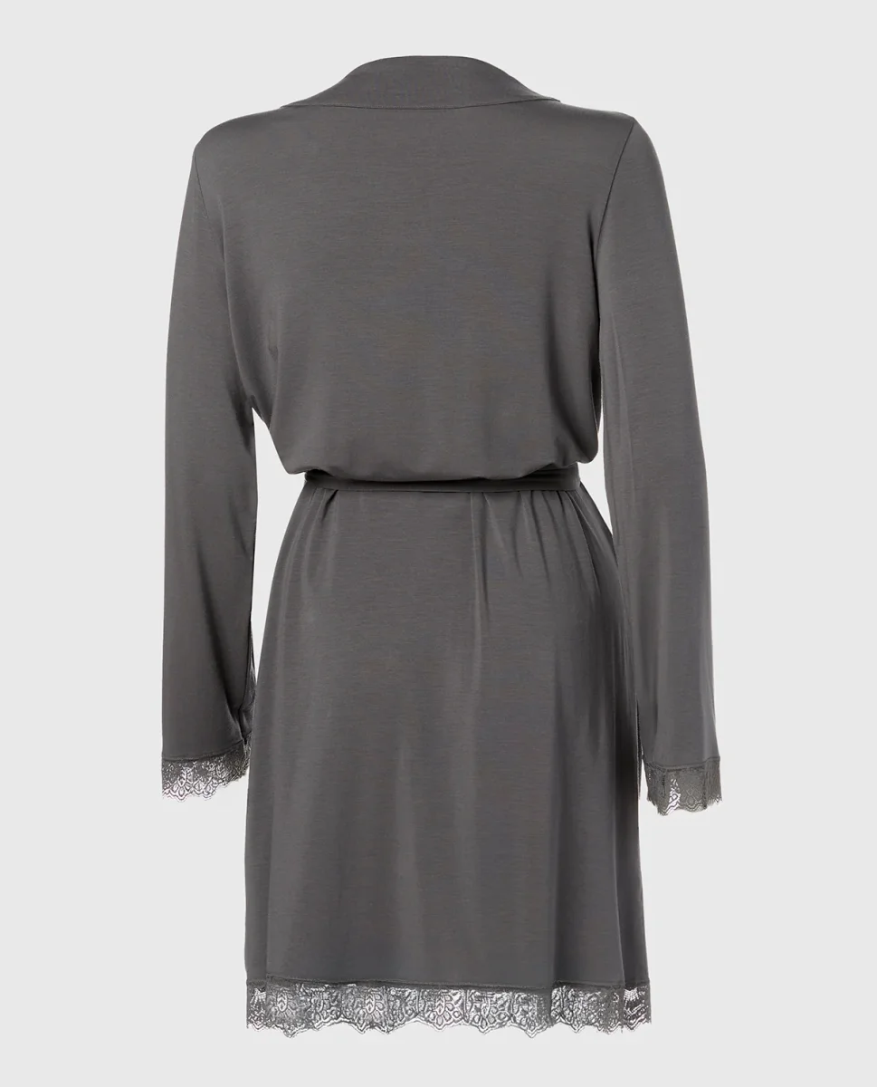 Wrap yourself in comfort with this lace-trimmed robe, designed for effortless lounging. Smoked Pearl brings a serene, stylish finish. A must-have for your sleepwear collection.