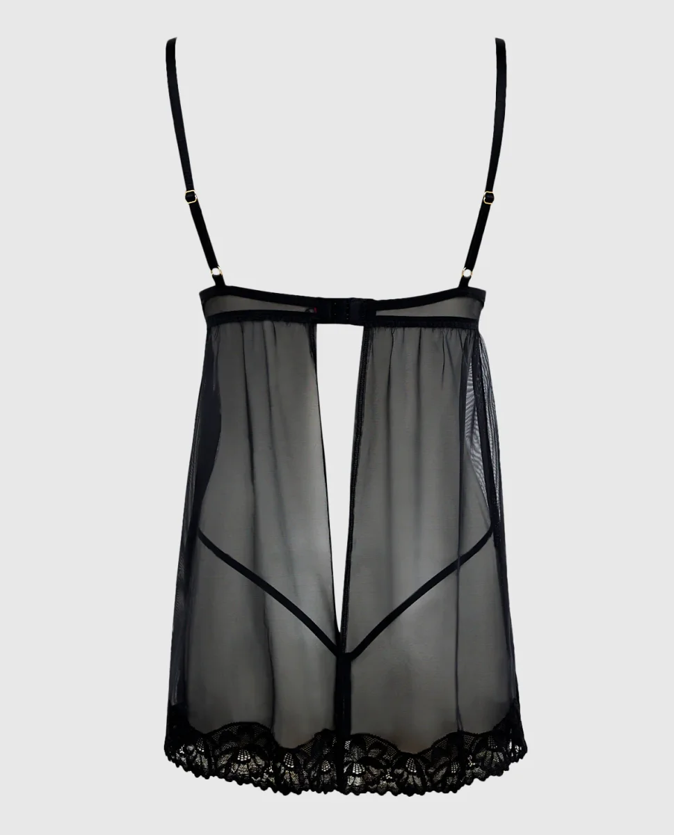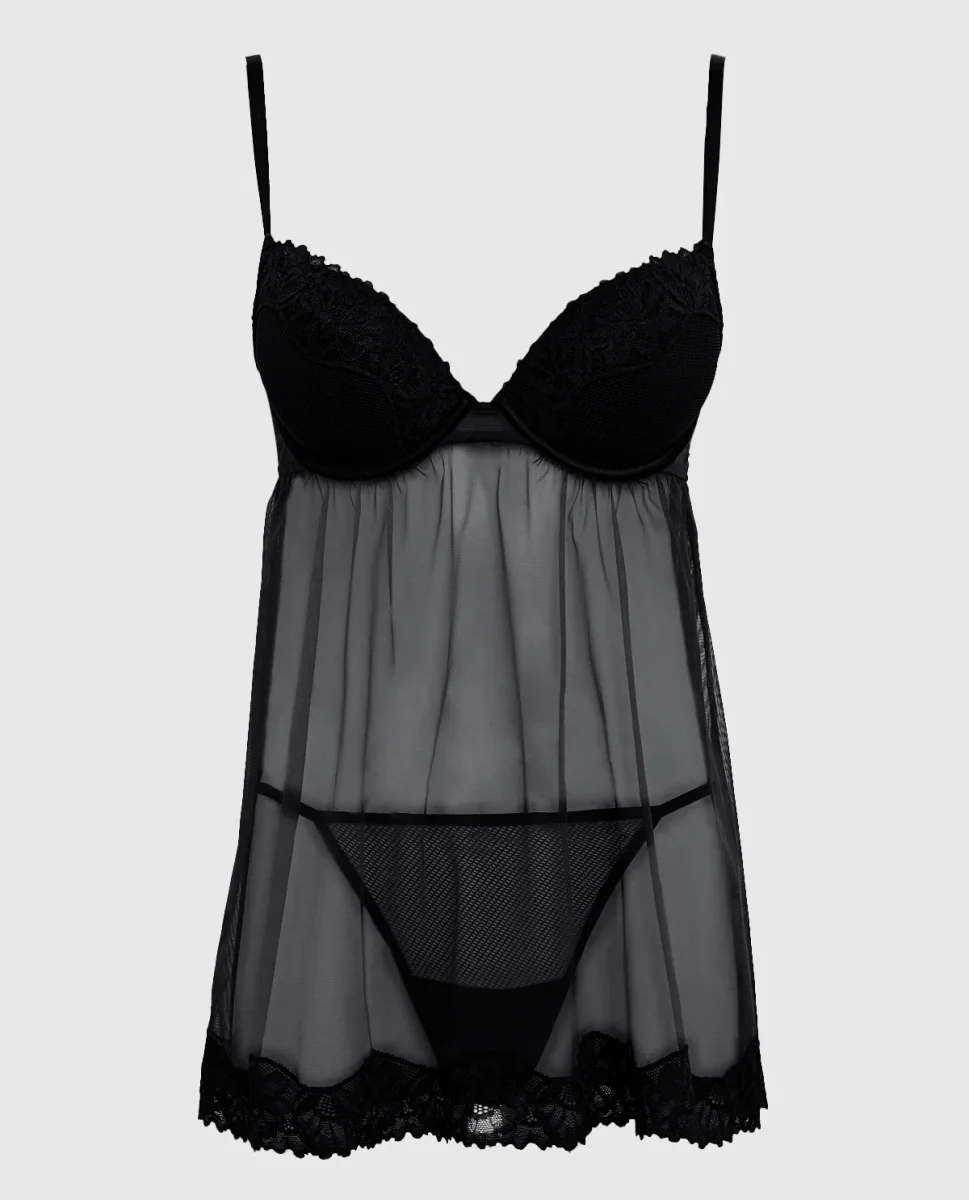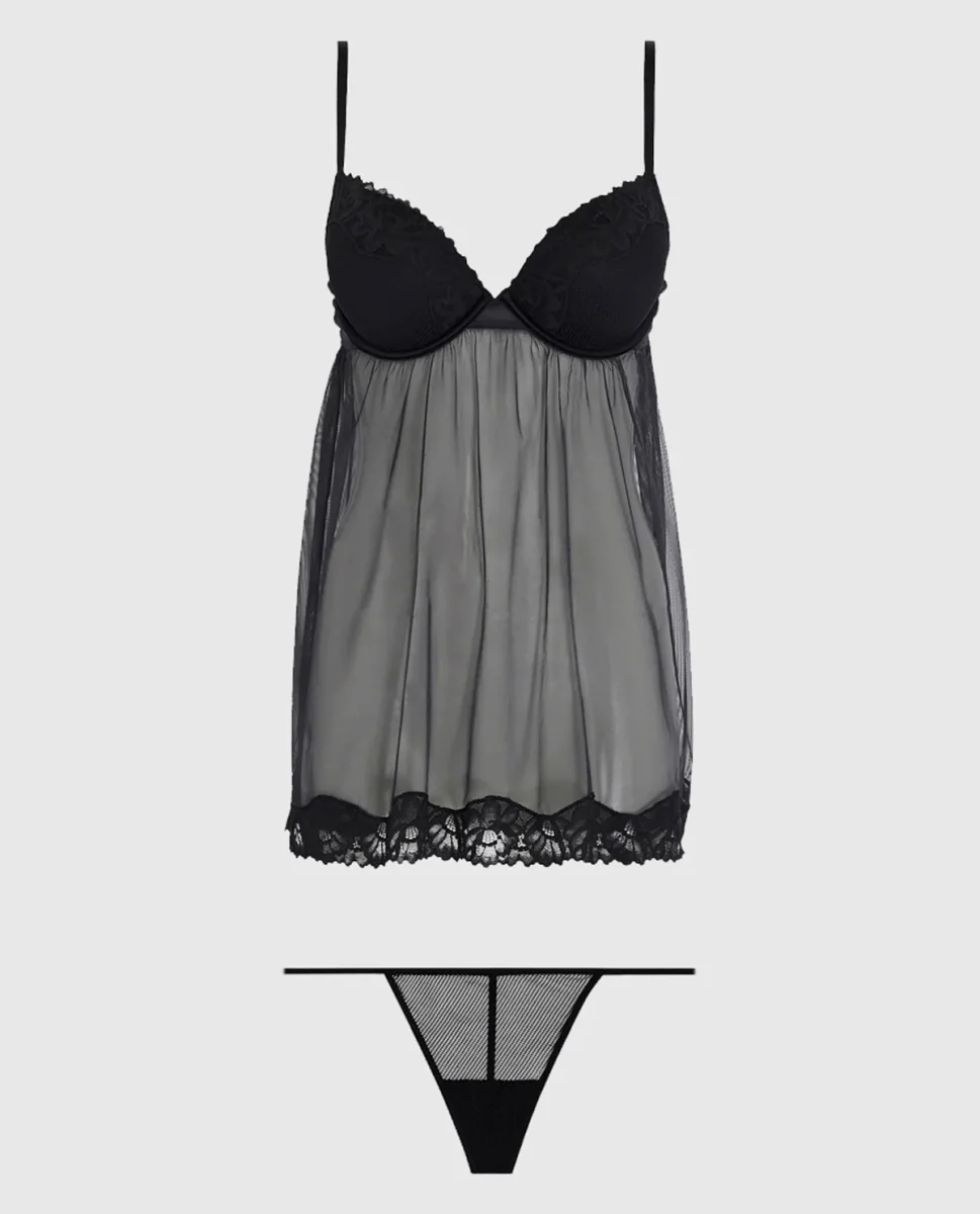 Sweet with a bit of an edge. Designed with our plunging push up cups and a g-string panty, this mesh babydoll is complimented with a touch of lace along the trim. Perfect for a night in.