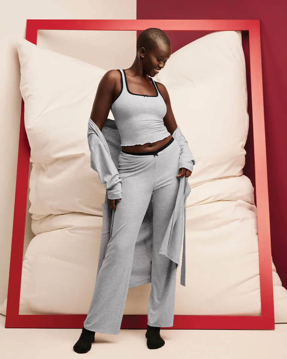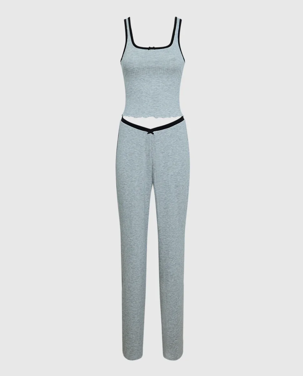 Designed with comfort in mind, these cozy and comfortable ribbed pajama pants are designed with a v-waist and perfect for the winter season. Pair with its matching tank. Perfect for gifting or for nights in!