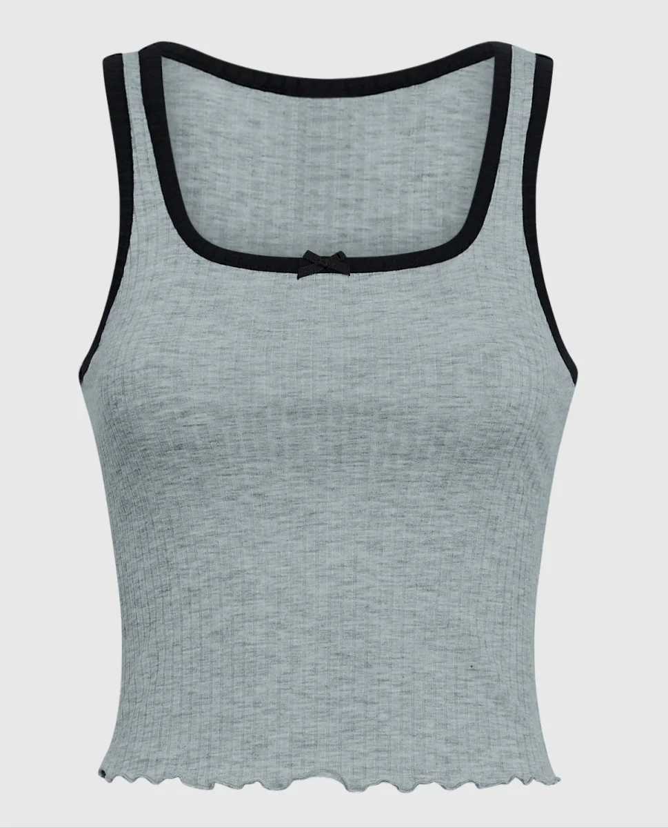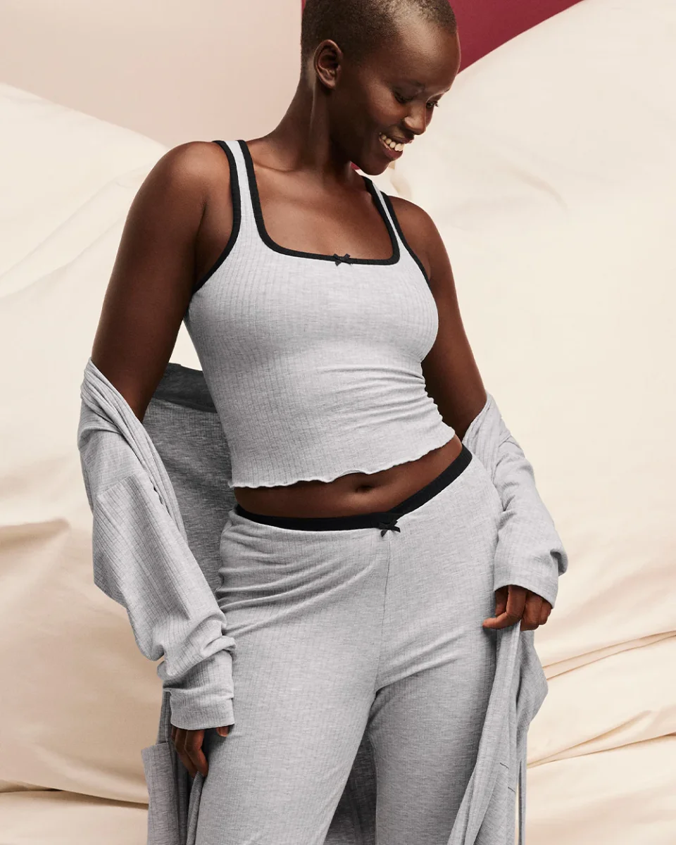 This ribbed pajama tank top will be your new favorite! Complimented with a small bow and perfect to pair with its matching pajama pant. Perfect for gifting and for you!