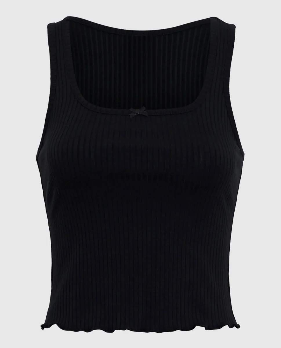 This ribbed pajama tank top will be your new favorite! Complimented with a small bow and perfect to pair with its matching pajama pant. Perfect for gifting and for you!