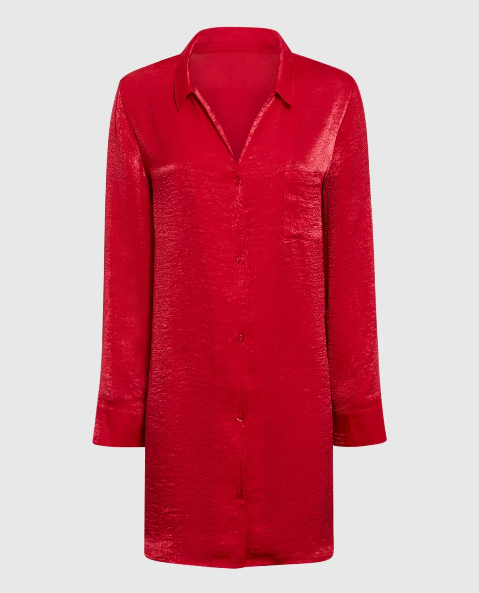 An elegant nighttime look. Our new satin sleep shirt is so lightweight and perfect for the evening. Detailed with dark lining and a pocket on the front. Great for gifting and for you. Lightweight Long sleeve Relaxed fit Imported Satin