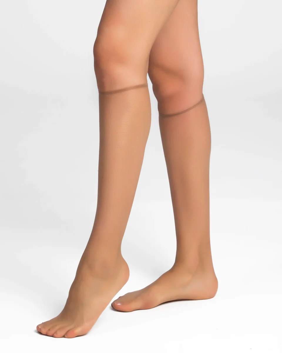 Elegance for every occasion, these sheer knee high stockings are great for any outfit. 17 Deniers Sheer bronzing effect Seamless with little to no compression Woven in France