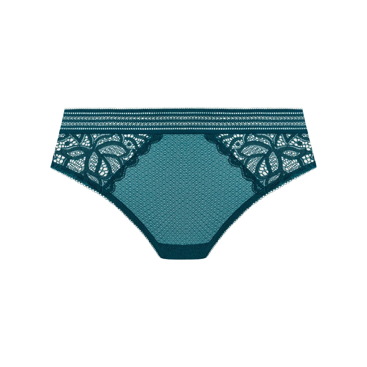 Sa taille mi-basse avec dos plus couvrant offre une couvrance rassurante. Le panneau avant en dentelle décorative stretch, doublé de tulle extensible, assure douceur et maintien, tandis que les empiècements en dentelle sur les côtésapportent une touche féminine raffinée.