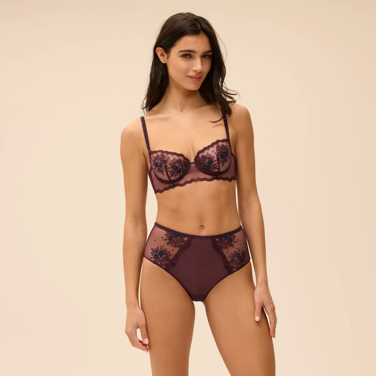 Sa broderie florale signature, emblème de la Maison, sublime la poitrine tout en révélant la peau avec délicatesse et élégance.