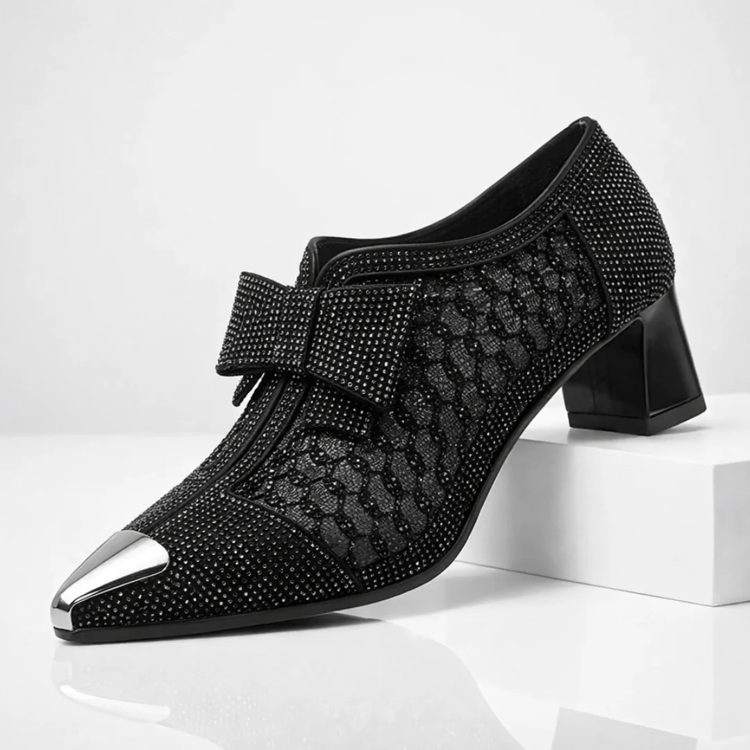 - Nœud surdimensionné et pointe métallique pour une élégance dramatique.